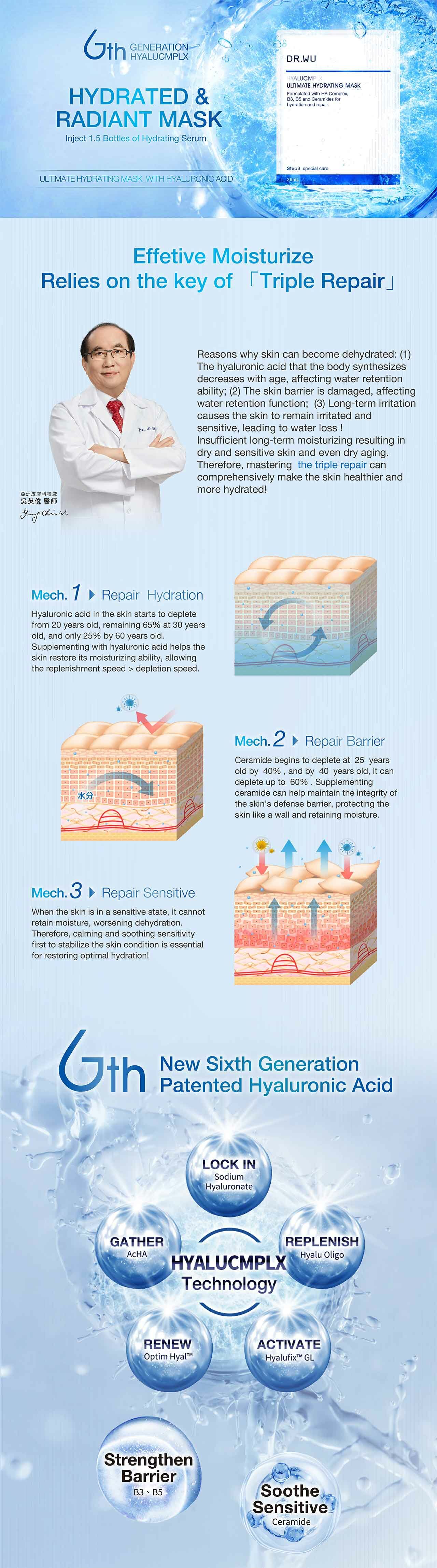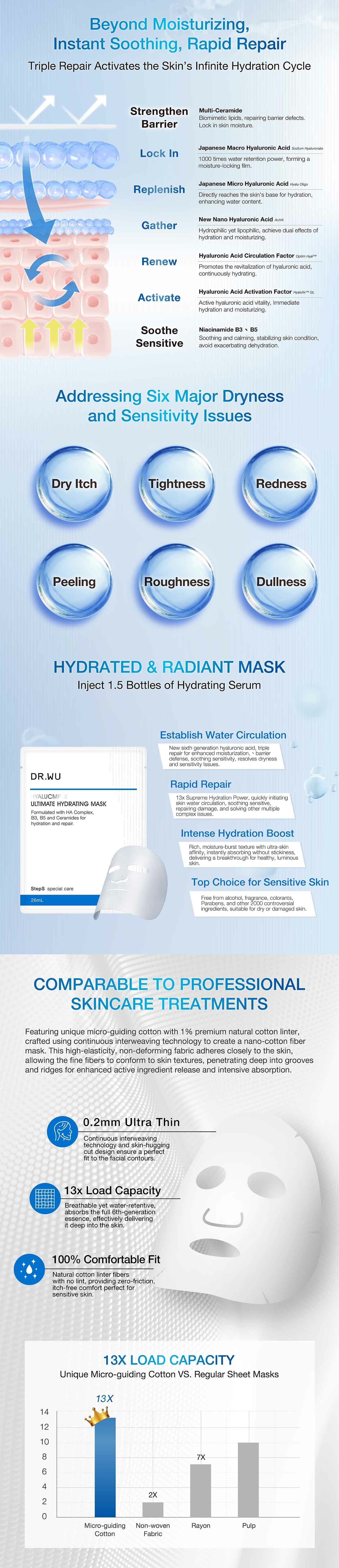 DR.WU獨特創新微導棉,嚴選1%頂級棉籽絨,輕盈絲綢觸感完美緊密貼合臉部曲線,敷一片=密集導入1.5瓶保濕精華,立即修復乾燥,瞬間肌發超強爆水力,肌膚彈、嫩、亮!。全成分無添加酒精、香精,敏弱肌適用。