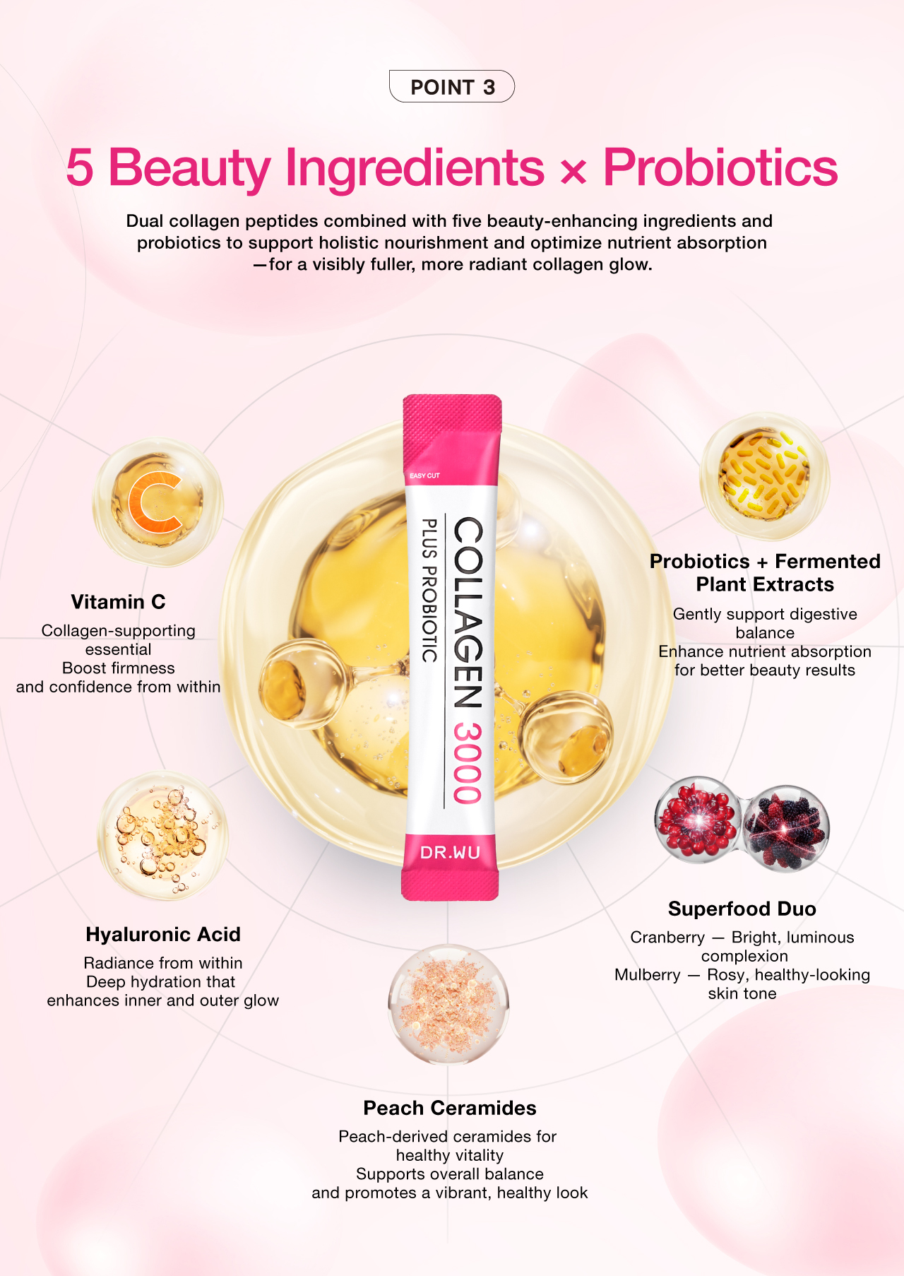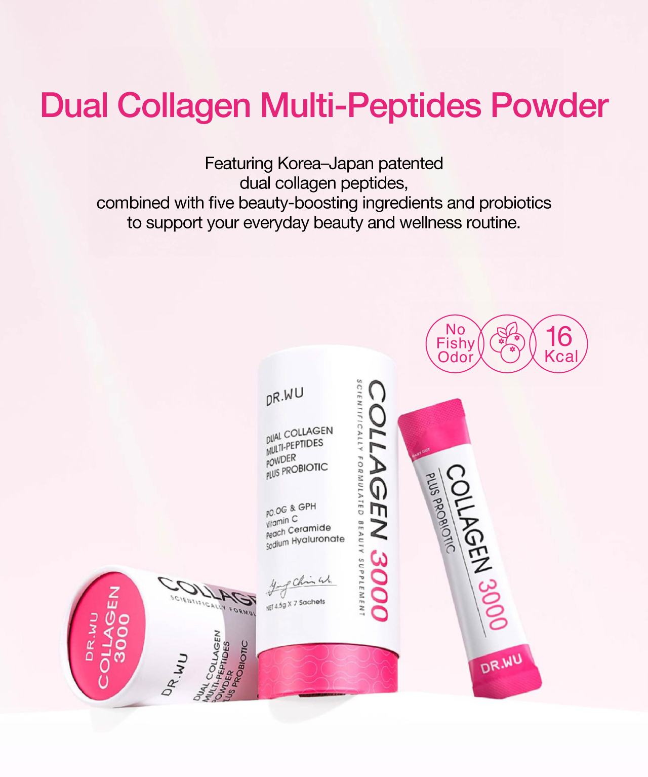 A daily beauty essential featuring patented Korean and Japanese dual collagen peptides (500Da for optimal absorption), enriched with peach ceramides, hyaluronic acid, vitamin C, and probiotics to boost absorption and support skin elasticity, hydration, and radiance.