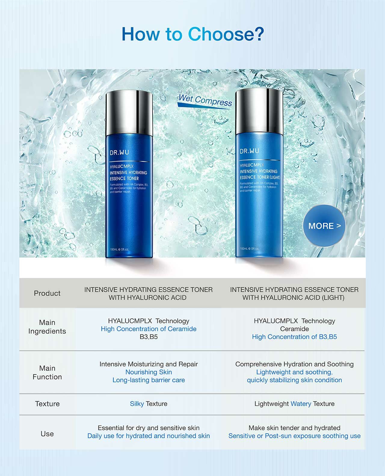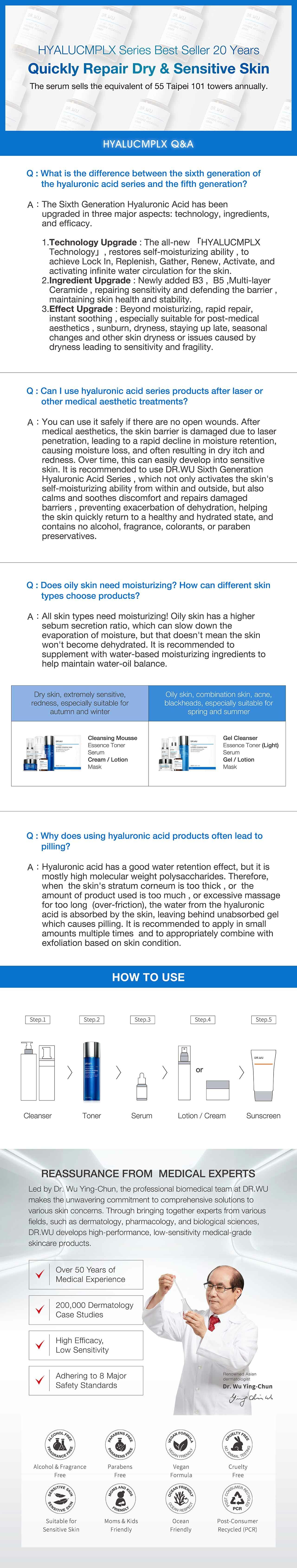 "HYALUCOMPLEX" not only formula combines macromolecular and small molecule hyaluronic acids from Japan, Germany, and France, but also has micromolecular hyaluronic acids added to lock-in, replenish, retain, and cycle moisture from the base of skin, thereby keeping the skin hydrated and luminous.