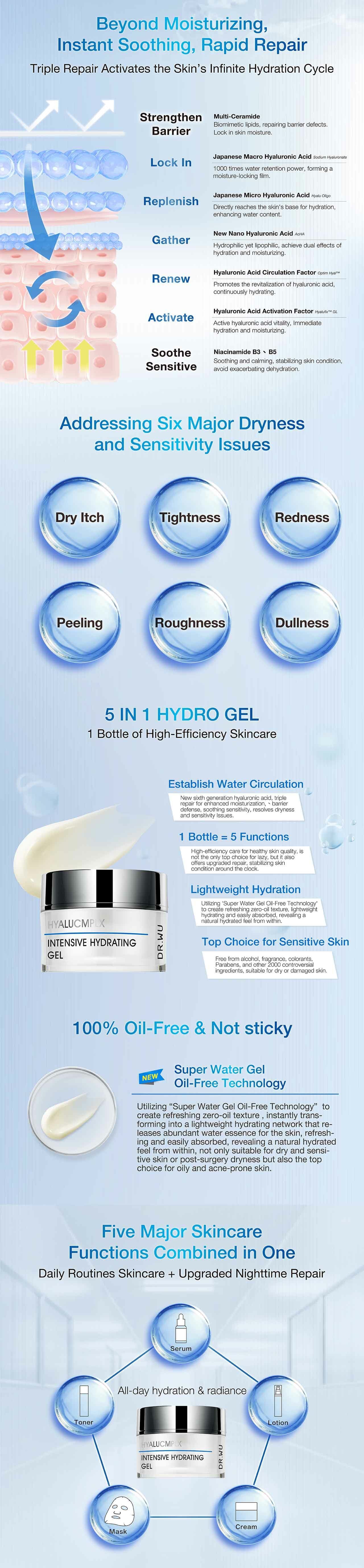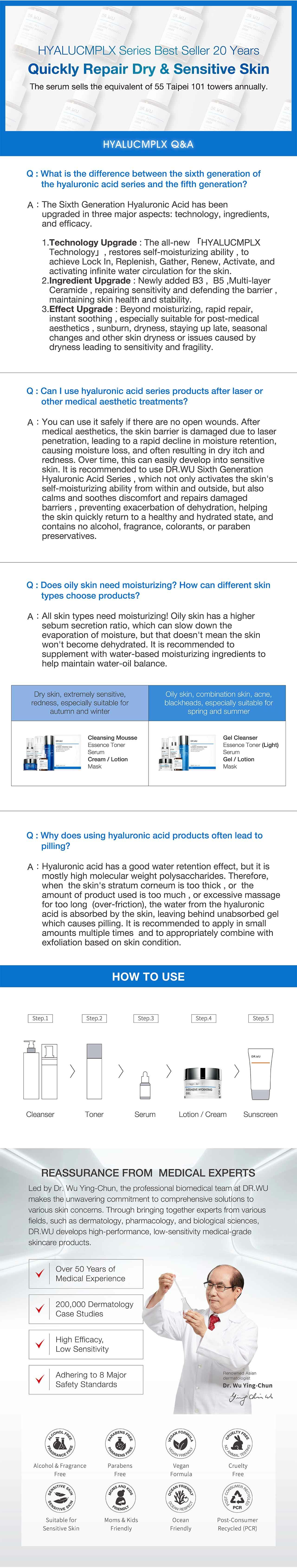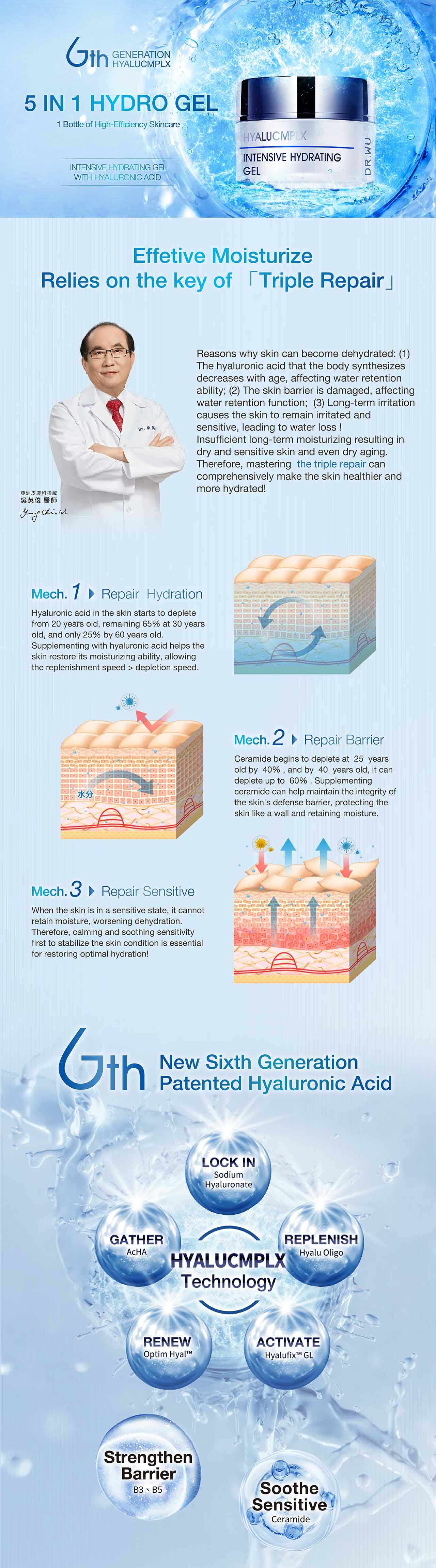 Combine the functions of toner, essence, lotion, cream, and facial mask in one bottle. The exclusive “Hyalucmplx” perfectly integrates 5 types of hyaluronic acid to achieve the best water locking, replenishing, infusion, rejuvenation, and polymerization hydration effects.