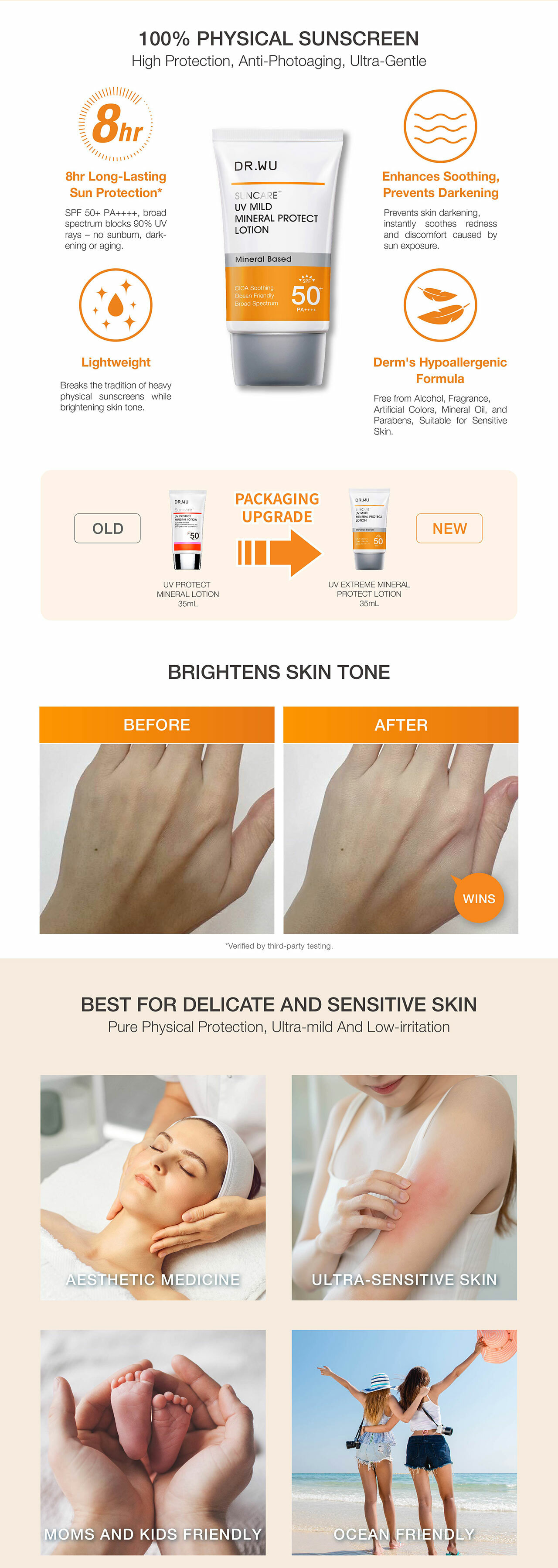 UV Mild Mineral Protect Lotion uses a 100%mineral shield to protect against UV rays and environmental irritants. Niacinamide,centella asiatica, and anastatica hierochuntica extracts reduce discomfort and repair the skin. This gentle, ocean-friendly formula is suitable for sensitive skin and children