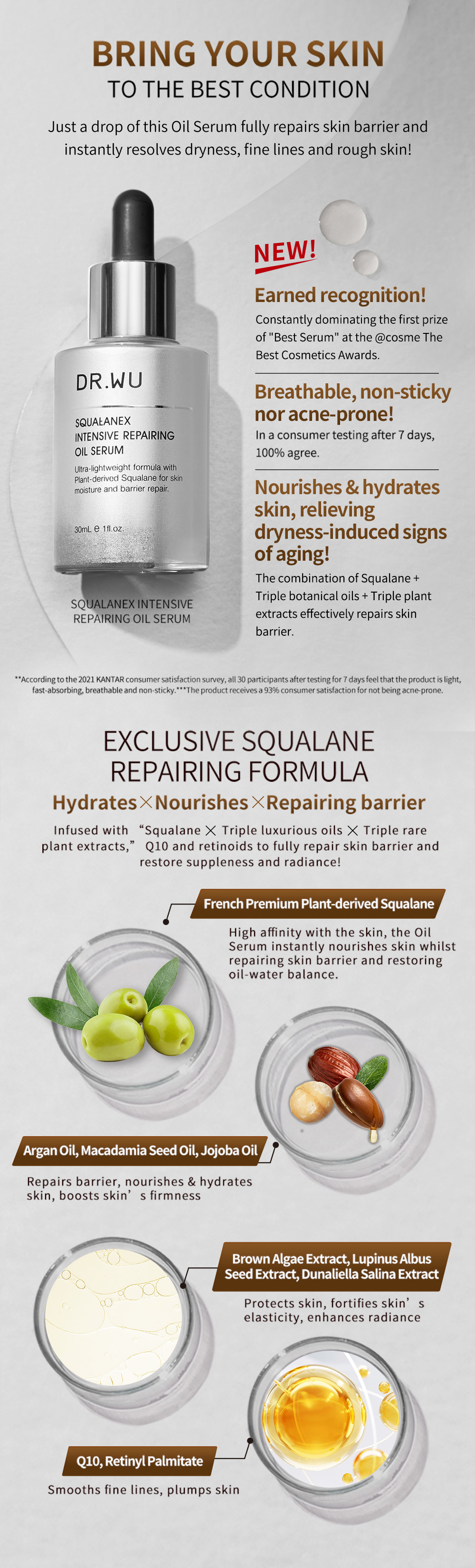 Just a drop of this Repairing Oil Serum unleashes the full prowess of the premium ingredients within, fully repairing skin barrier, relieving dryness and smoothing fine lines and rough skin in an instant. All-round revitalizing and nourishing, refined and radiant skin!