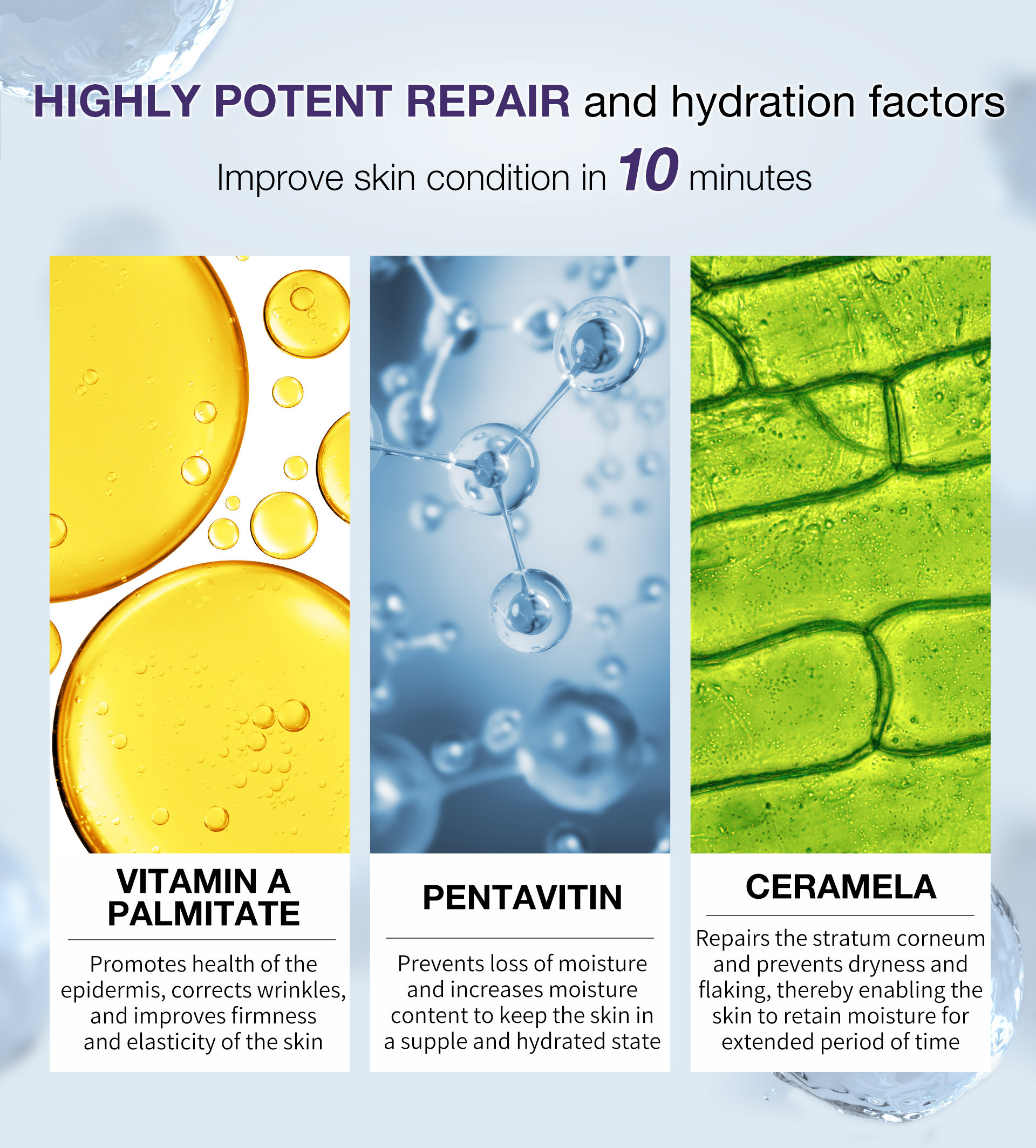 Designed specifically for dry and dehydrated skin, the solution nourishes and corrects dryness from the surface while keeping the skin hydrated for extended period of time.