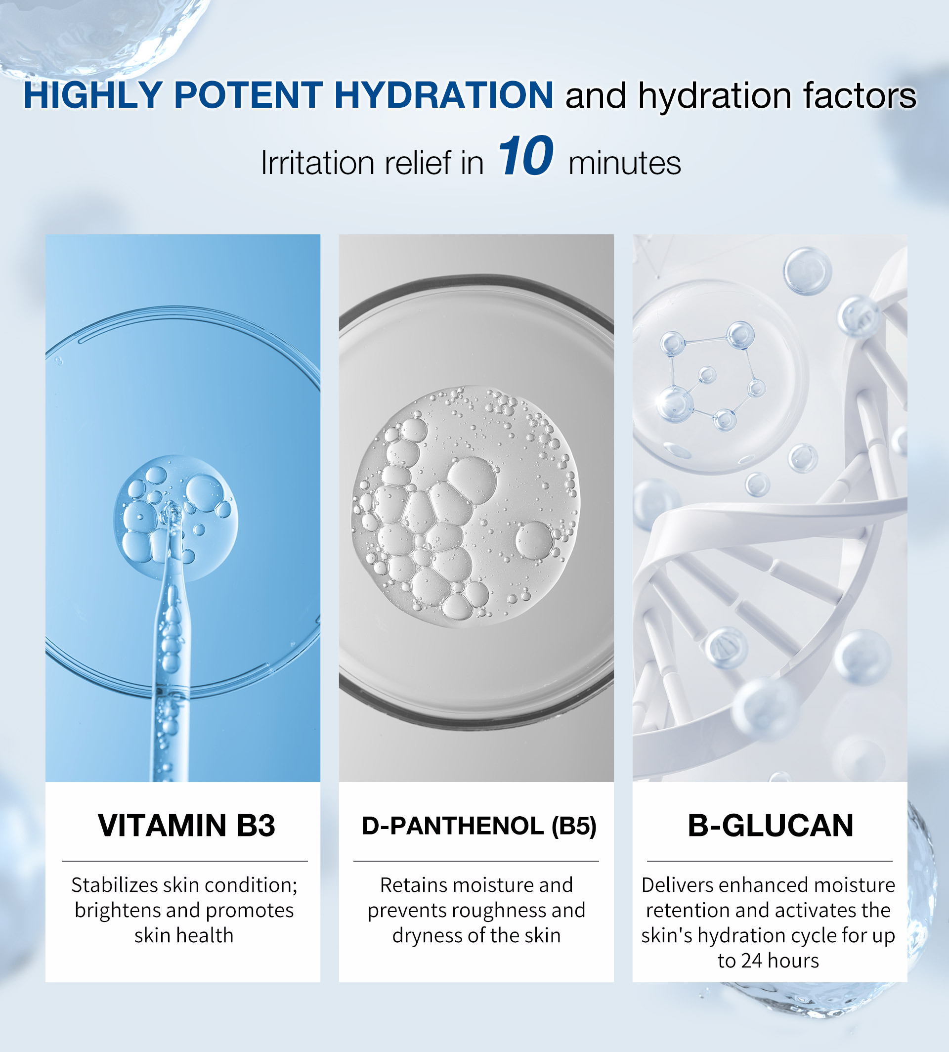 By combining B3, B5, and β-glucan, the solution increases moisture content of the skin and creates a natural barrier that delivers enhanced hydration and restores healthy glow to the skin.
