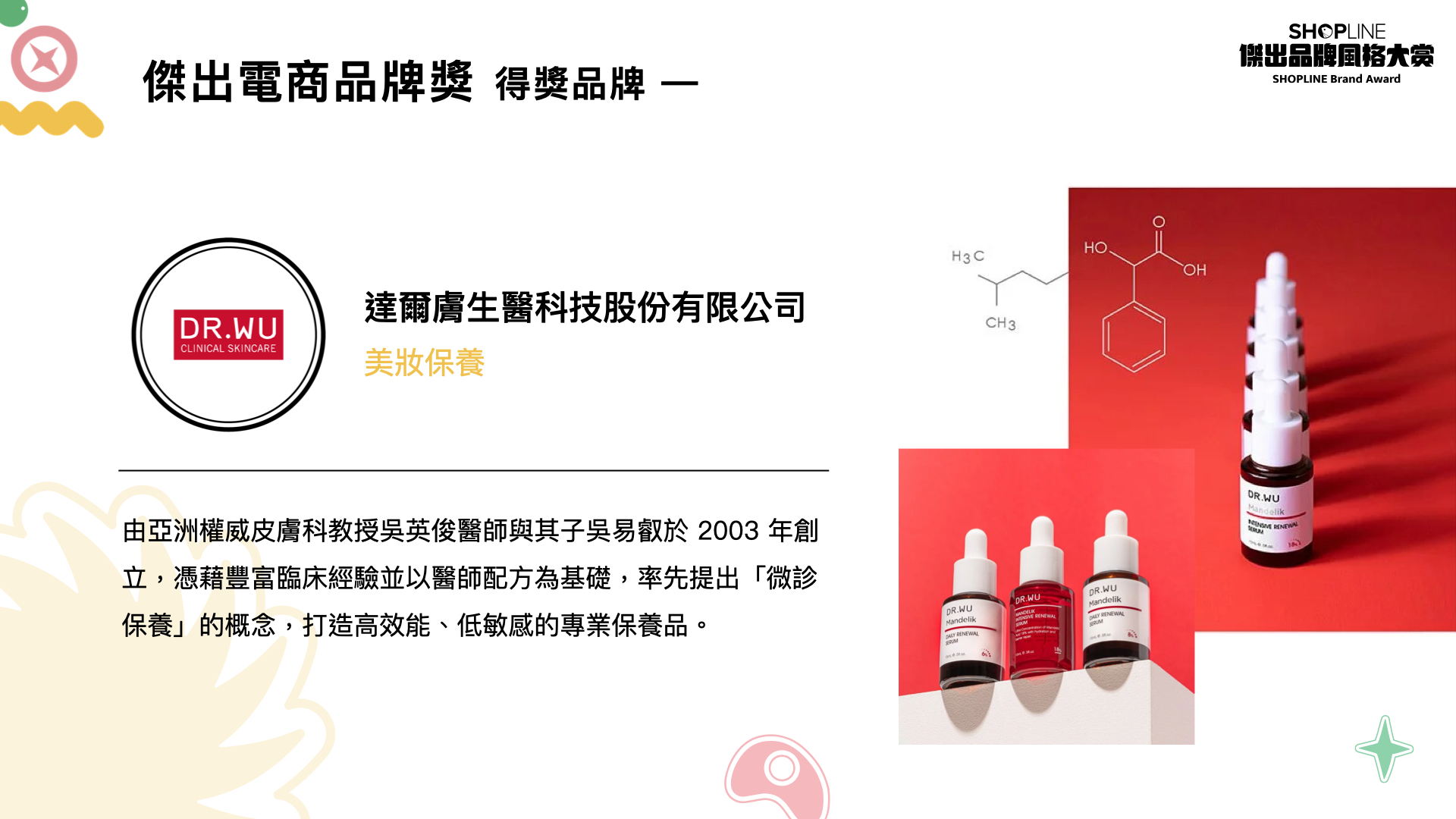 DR.WU從200多個參賽廠商中脫穎而出,榮獲SHOPLINE的2022年第三屆傑出品牌風格大賞,得獎理由是運用豐富的視覺傳遞品牌精神,運用皮膚科學不斷創新商品,加上多元化的消費者購物體驗,深受業界各領域指標性專家、政府單位組成評審團肯定!