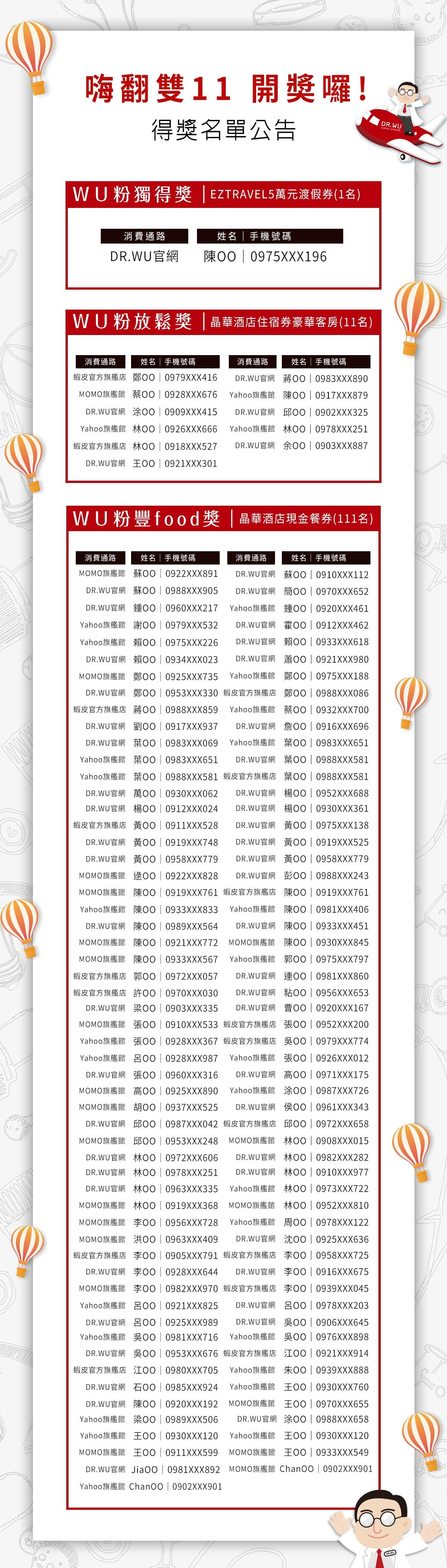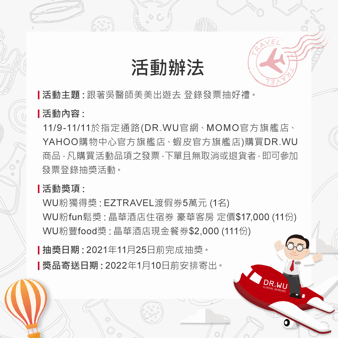 2. 本活動獎項包含旅遊商品(例如:飯店住宿或機票等),DR. WU與旅遊行程之提供者無任何代理或合夥關係,有關行程中所產生之糾紛或法律問題皆由旅行社或飯店業者自行負責,DR. WU不負任何責任。