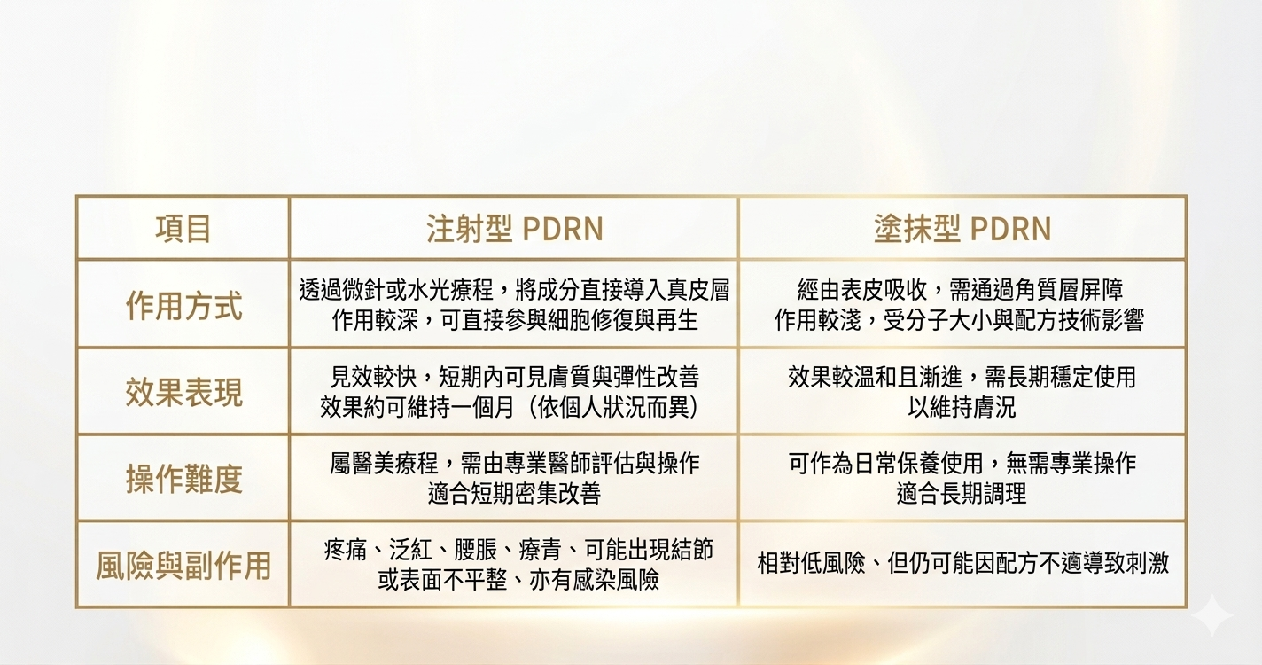 當PDRN被應用於醫美療程與日常保養品時,常見可分為「注射型」與「塗抹型」兩種形式,而兩者的本質差異,主要來自於作用層級與進入肌膚的深度不同。