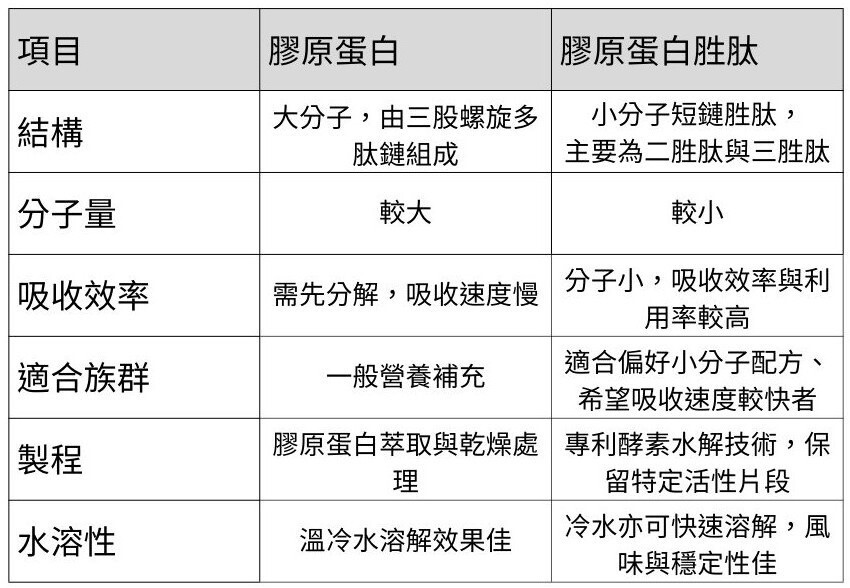 然而,膠原蛋白的分子量較大,進入體內後需要先被分解成更小的胺基酸與胜肽才能被吸收;若消化與吸收效率不佳,利用率可能會降低。