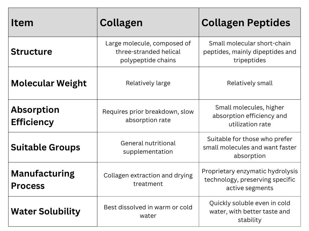 Traditional collagen molecules are relatively large, which can hinder the absorption. In contrast, collagen peptides are produced through enzymatic hydrolysis, reducing their molecular weight to below 5,000 Daltons, significantly improving both absorption efficiency and bioavailability. For individuals who prioritize visible and effective results, peptide-form collagen is the preferred choice. Among these, dipeptides are known for their long-lasting physiological effects, while tripeptides can be as small as 500 Daltons, allowing for rapid absorption. When used in combination, they may offer synergistic benefits in supporting skin health and repair.