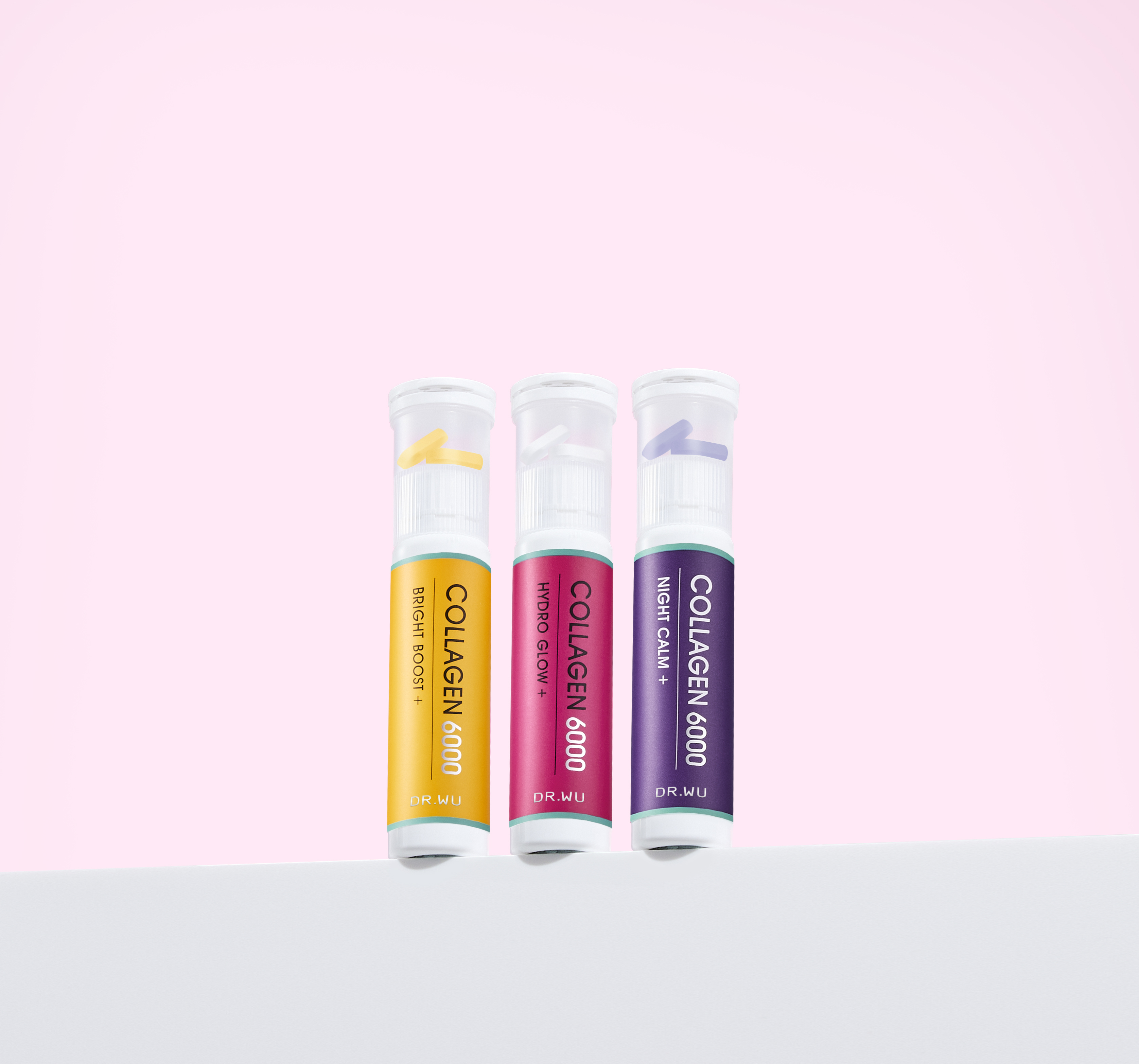 除了上述4種常見類型,現在也有品牌整合不同劑型的優勢,推出全新的「雙劑型」組合。以 DR.WU的Beauty Shot系列為例,以雙膠原蛋白胜肽飲結合不同功能的美妍錠,針對各種膚況推出「水光」、「亮妍」、「晚安」三款配方。可以根據當下肌膚的需求自由選擇,讓保養變得更輕鬆,天天都能喝出有感美肌!