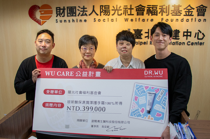 燒燙傷友們往往因外表的差異,飽受異樣眼光,在求學、就業路上備受艱辛,DR.WU早於2016與陽光基金會合作,展開Bring Love To Life《守護陽光、用愛灌溉》公益活動,今年首屆的WU CARE公益計畫,再度攜手陽光基金會,一起守護燒燙傷友!全新的玻尿酸保濕潤澤護手霜,吸引眾多民眾熱情響應,首波限量1000支已全數銷售完畢,今日DR.WU年度代言人吳慷仁、生命鬥士莊雅菁與DR.WU 董事長吳奕叡更一同現身陽光基金會,將千支護手霜所得100%捐贈陽光社會福利基金會[燒傷及顏損者生心理重建服務]專案*!協助他們走出黑暗,自信面向陽光。