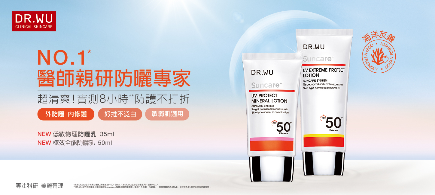 DR.WU全方位防曬系列今年再添兩大生力軍,分別是專為敏感肌與幼童打造的「DR.WU低敏物理防曬乳SPF50+」以及專為戶外運動打造的「DR.WU極效全能防曬乳SPF50+」!「DR.WU低敏物理防曬乳SPF50+」採用全物理寬頻防曬劑,搭配修復力強大的積雪草與復活草萃取,急速舒緩曬後肌膚,長效滋潤保濕,同時採用專屬蜂巢分散技術,突破一般物理防曬黏膩且不易均勻塗抹的缺點,成就清爽不泛白的高效物理防護!不只敏感肌,甚至連肌膚細嫩的幼童都可安心使用。「DR.WU極效全能防曬乳SPF50+」則採用清爽水乳劑型,且通過歐盟嚴苛的COLIPA抗水測試,能有效抗水抗汗,即使汗水淋漓仍具有超強效防曬力,同步運用獨特交聯折射技術,在肌表形成緊密交錯的高效防護網,全方位阻隔外在刺激與傷害!此外,DR.WU重視環境保護與海洋生態,「DR.WU低敏物理防曬SPF50+」與「DR.WU極效全能防曬乳SPF50+」皆符合夏威夷及帛琉海洋友善規範,即使全家至海邊出遊也可安心防曬,守護珍貴的海洋環境。