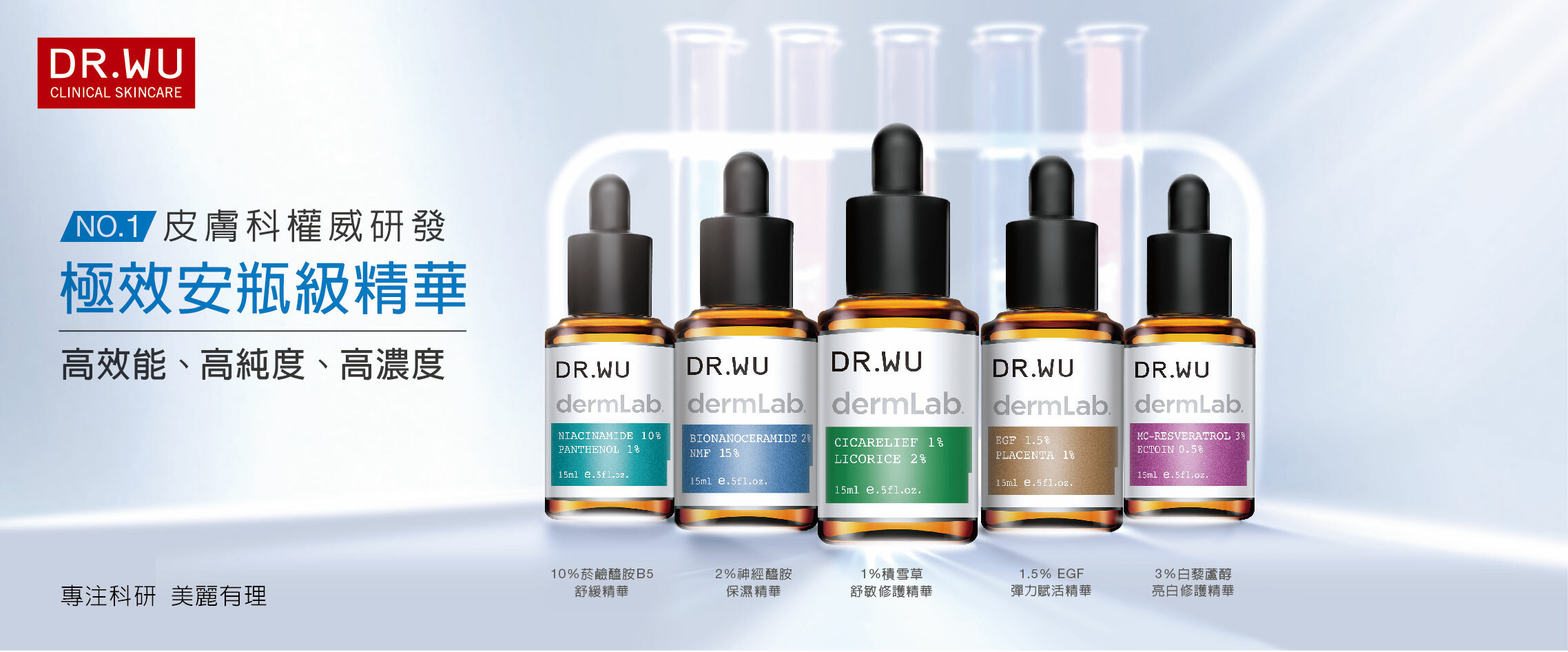 台灣NO.1醫美保養品牌DR.WU模擬醫師配方,嚴選高效成分,打造高效能、高純度、高濃度的實驗室精華系列!安瓶級高效美肌力,去年一推出就廣受消費者好評推薦,今年更強勢推出1%積雪草舒敏修護精華、3%白藜蘆醇亮白修護精華與1.5% EGF彈力賦活精華,三大全新精華,滴滴高效,直達肌底,精準解決肌膚問題,重現透亮無瑕美肌。