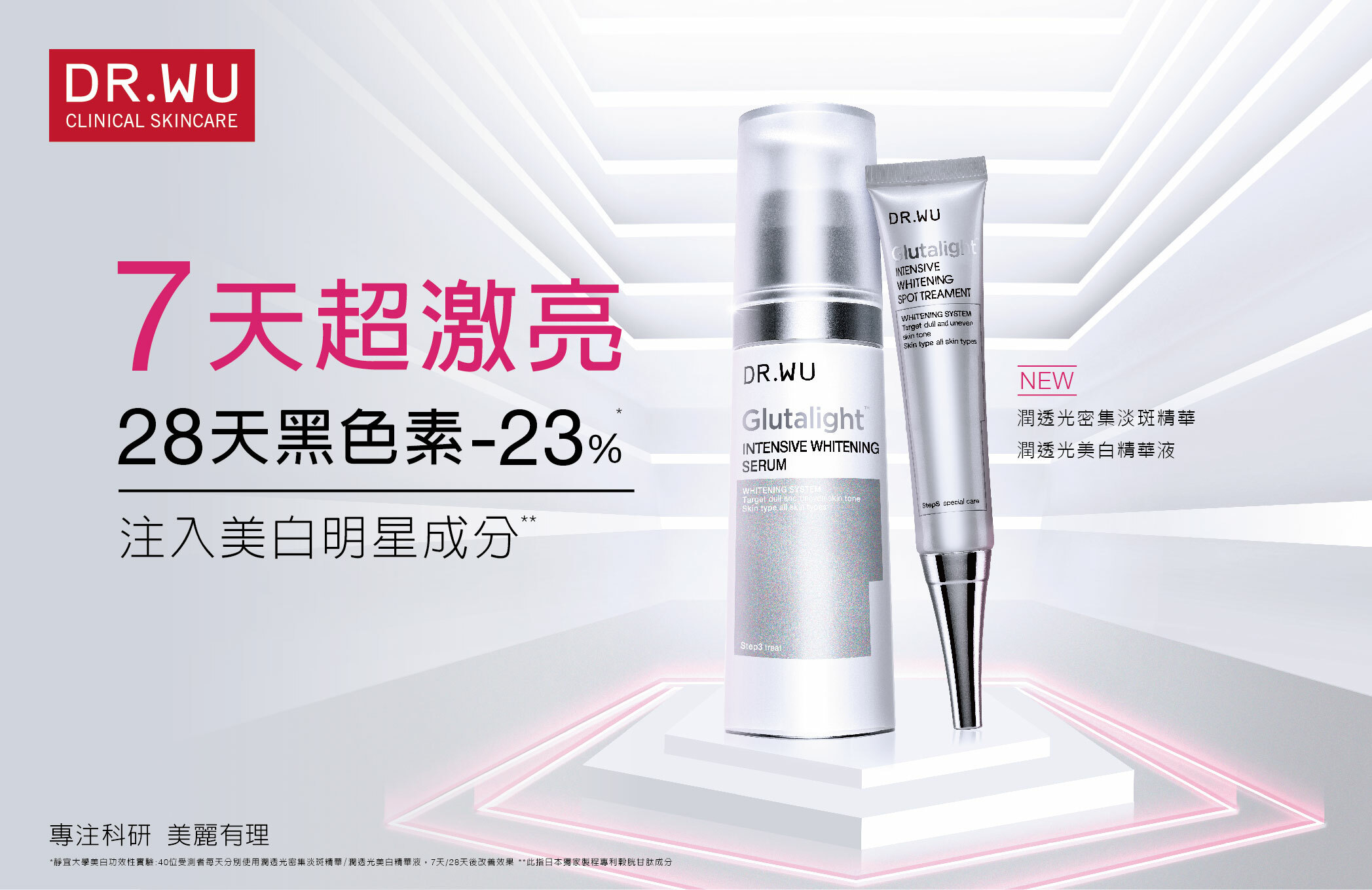 為滿足消費者速效美白需求,DR.WU潤透光美白系列首創[潤透光美白配方Glutalight™ ],獨家採用美白針明星成分-日本製程專利穀胱甘肽*,搭配維他命C醣苷,從源頭抑制並精準阻斷黑色素生成,協同維他命B3、B5、B6、水飛薊植萃與日本專利小分子玻尿酸,美白同步保濕,全系列不含光敏感及刺激性成分,日夜使用不反黑,敏弱肌也適用。2019年推出的美白精華液廣受各界好評,7天肌膚超激亮,28天黑色素減少23%**!今年推出全新[潤透光密集淡斑精華],28天瓦解頑強黑斑;以及注入1.5瓶美白精華的[潤透光美白微導面膜],快速改善暗沉,肌膚亮到發光!