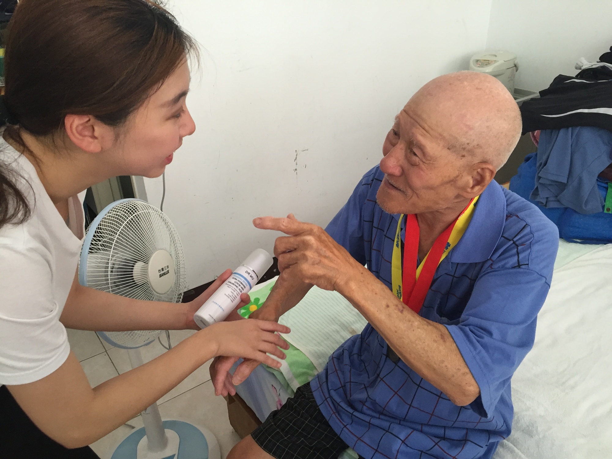阿公的肌膚很乾燥,手上刻著歲月走過的痕跡,DR.WU同仁除了帶來平日物資外,也特地準備了玻尿酸保濕精華乳,幫阿公均勻塗抹於臉部肌膚,讓原本的肌膚更保濕滋潤,減少肌膚乾裂、乾紋產生的狀況。