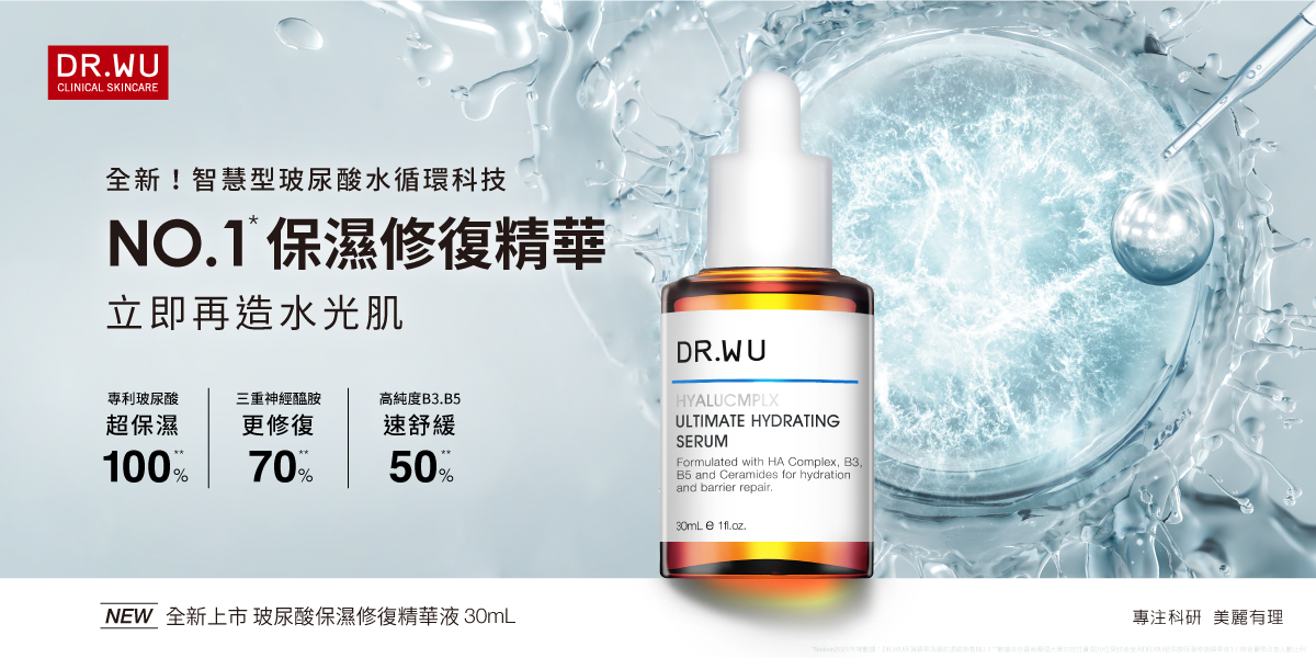 為了回應消費者的需求,NO.1醫美保養品牌DR.WU,也在品牌最經典的玻尿酸保濕系列中推出全新的#水繃帶「玻尿酸保濕修復精華液」,除了升級業界唯一專利全新「智慧型玻尿酸水循環科技HYALUCMPLX」、加入全新微分子玻尿酸外,還全新添加菸鹼醯胺(B3)、維他命原B5、三重神經醯胺、七重有機舒緩植萃等修復舒緩成分,以達到修復保濕力、修復防禦屏障、修復敏感不適,全面提供乾燥肌、敏弱肌更完整的保濕解決方案。