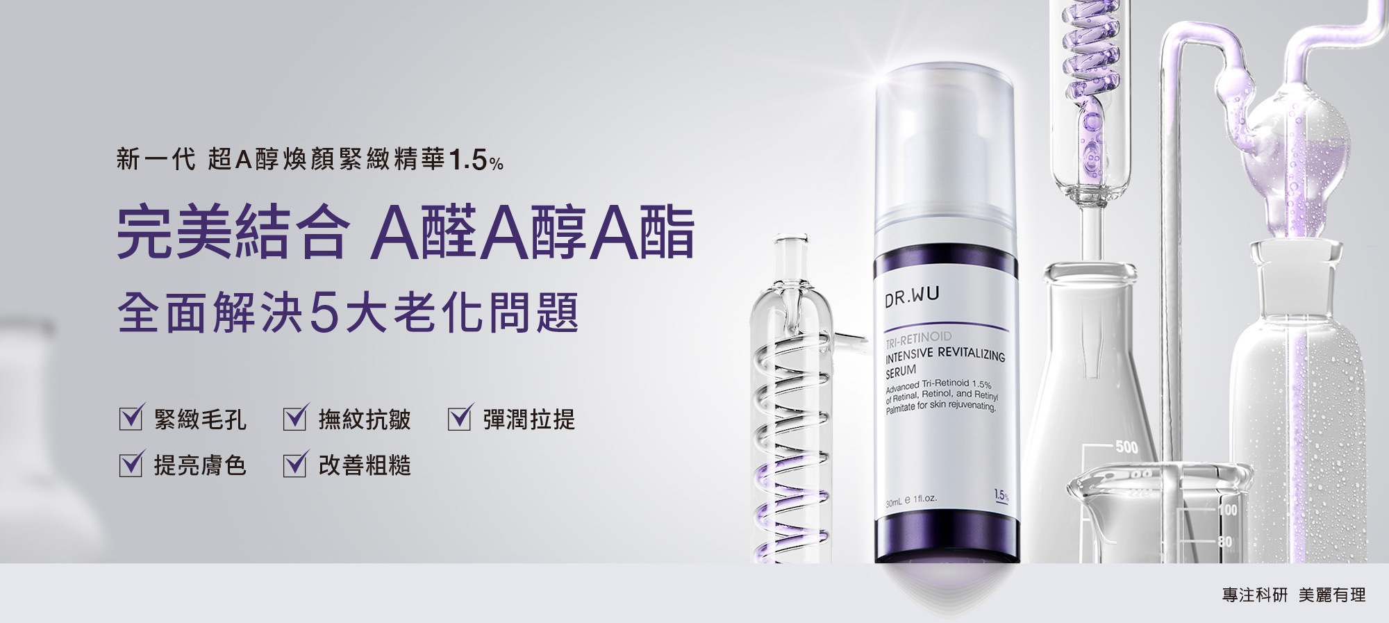 為了克服維A家族較刺激和不穩定的問題,又要讓它能更高效,「DR.WU超A醇煥顏緊緻精華1.5%」經過專業科研與精密計算,獨家專研出結合A醛、A醇、A酯的新一代超A醇,且添加總量高達1.5%的高濃度,為肌膚提供高效且長期的抗老能量,又能降低灼熱、泛紅、脫皮、乾燥等副作用,在有效煥膚抗老與皮膚刺激風險中取得絕佳平衡。除了強勢抗老的新一代超A醇外,「DR.WU超A醇煥顏緊緻精華1.5%」也搭配高效偕同配方:1. 添加六胜肽、Q10增加抗老能量,能強化防禦力讓肌膚更緊緻,使肌膚看起來更年輕。2. 搭配菸鹼醯胺B3和植物甾醇、鼠李糖、甘草酸二鉀等舒緩植萃,緩解肌膚刺激與不適。3. 添加玻尿酸及維他命原B5,同步為肌膚補水、改善粗糙、強化屏障。