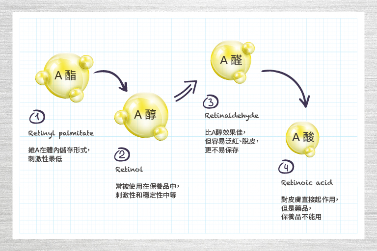 不過,A酸因為刺激性高而必須由醫師開處方,屬於藥物而非保養品,因而保養品裡所使用的是比A酸刺激性更低的A醛、A醇、A酯,它們被皮膚吸收後會被轉換成A酸利用,其中,A醛能直接被轉換成A酸,最有效但也最刺激、最不穩定;目前正當紅的A醇則需要先被轉成A醛後再變成A酸,它不像A醛那麼直接見效,但刺激性與穩定性也比A醛更溫和;A酯則是三者中刺激性最低、最穩定的,但它要經過三步驟轉換,見效時間更長,也更加溫和。