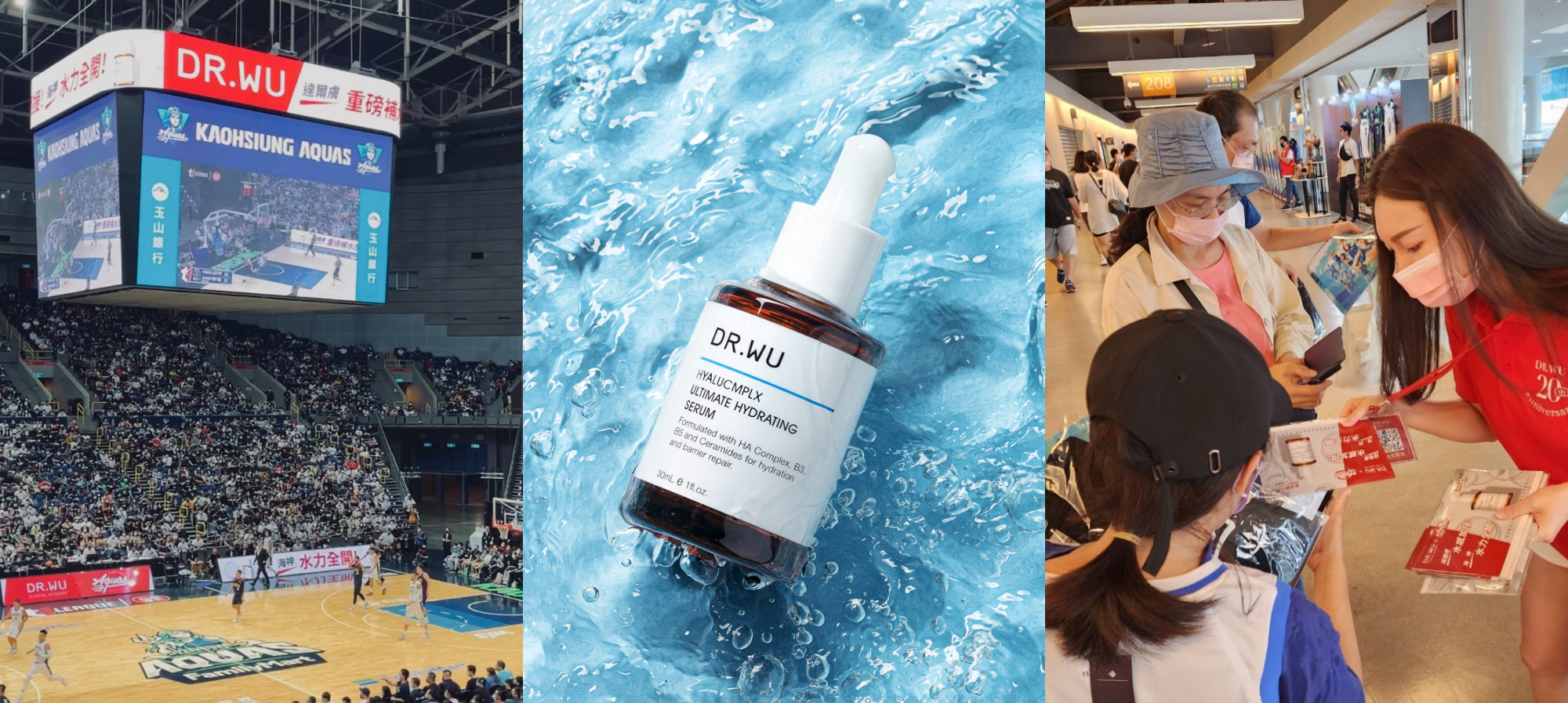 DR.WU挺職籃,宣布贊助T1聯盟冠軍隊高雄全家海神籃球隊,這也是No.1醫美保養品牌DR.WU首度跨界應援職業籃球隊,除了提供球隊實質的贊助外,也派出品牌最熱賣的補水強棒#水繃帶「玻尿酸保濕修復精華液」,幫全體球員、啦啦隊及球迷重磅補水。賽季期間,只要在海神主場高雄巨蛋出賽,球場攝影機會Tag現場3位最水球迷,贈送價值3970元的玻尿酸重磅補水禮盒;到高雄巨蛋觀看海神隊比賽的群眾,只要加入DR.WU 官方Line好友,就能現場獲得價值500元的補水體驗包;沒買到球賽票的人也有機會,只要加入DR.WU 官方Line好友並參與互動,就可抽1月15日與2月12日高雄全家海神對壘魔獸之戰的入場券。