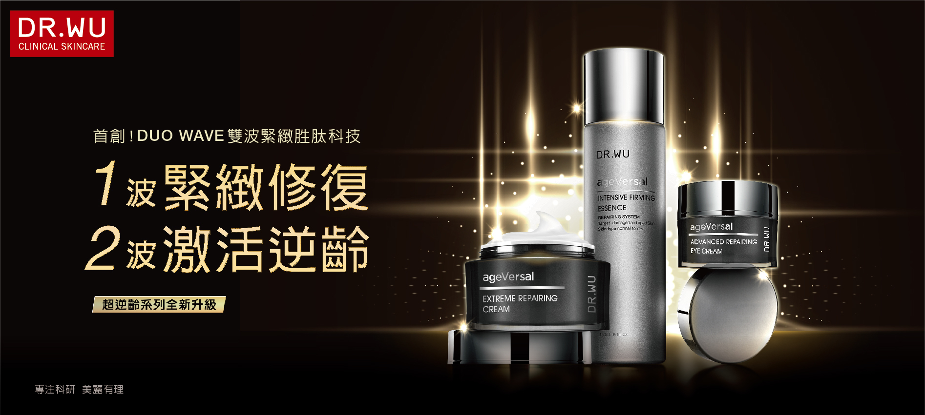 DR.WU逆齡修復系列,針對輕、熟齡肌量身打造,其中「角鯊潤澤修復精華」,稱霸美容排行No.1多年,榮獲眾多網友一致愛用好評,被鐵粉譽為潤澤修復神品!歷時多年專研,NO.1的逆齡修復系列**再次升級,由亞洲權威皮膚科教授吳英俊醫師親自研發,完美結合「瑞士冰河植萃肌因」與「超電波複合胜肽」兩大逆齡配方,首創「雙波緊緻胜肽科技」,推出「超逆齡緊緻精華露」、「超逆齡修復精華霜」與「超逆齡多肽修復眼霜」三大新品,打造7天年輕一歲,緊緻修復80%*的極致功效!雙波緊緻胜肽科技中的「瑞士冰河植萃肌因」萃取生長於極端氣候,獨具生命力的阿爾卑斯山珍珠花,為肌膚注入驚人修復力,還原強韌度與彈潤度,而「超電波複合胜肽」則由4大高效胜肽組成,精準擊破各式老化現象,重現無齡感美肌!