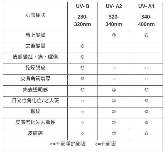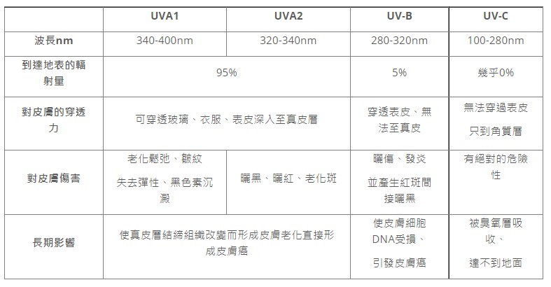 整體來說,紫外線波長大致可分為三種,UVA(波長320~400nm,又稱曬黑波段),透射能力可達真皮層,透射力強、作用緩慢且持久的特點。UVA雖然不會引起皮膚急性炎症,但它對玻璃、衣物及人體表皮有很強的穿透力,可先穿透表皮再到達皮膚的真皮層,其中UVA又可分為UV-A1、UV-A2,其中UV-A1(波長 340~400 nm )屬於長波範圍,穿透最強可達皮膚最深,可深達真皮層使皮膚曬黑。對皮膚的傷害性最大,但也是對它最容易忽視的,特別在非夏季UV-A1強度較弱但仍然存在,因為長時間累積的量足以讓皮膚傷害。像是皮膚老化鬆弛、皺紋、失去彈性、黑色素沉澱…等均由UV-A1所造成的。UV-A2(波長 320nm-340nm)穿透力較UVB來的深,對皮膚的傷害也較大些,引起皮膚曬紅發痛、肌膚暗沉、水分流失快速、日光性角化症(老人斑),主要是UVA-2所造成的。