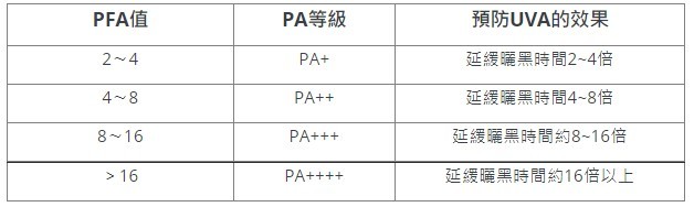了解完UVA與UVB對肌膚的嚴重影響後,我們再來看看防曬產品上標示許多數值,各代表什麼意義?首先可先從PFA數值評估防曬品對UVA的防禦能力,或從SPF數值(Sun Protection Factor)指防禦UVB曬傷、曬紅的係數。