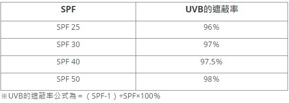 SPF數值對應UVB遮蔽率(指防禦UVB曬傷、曬紅的係數)