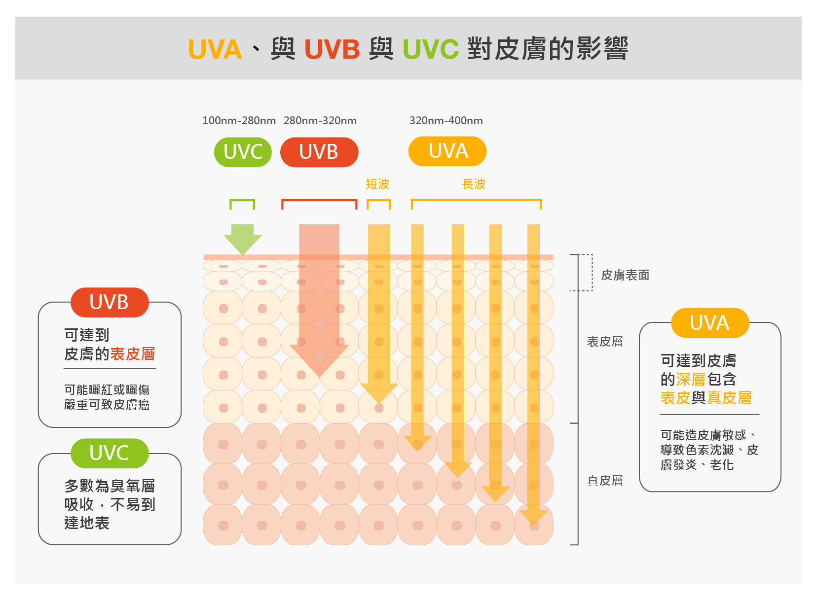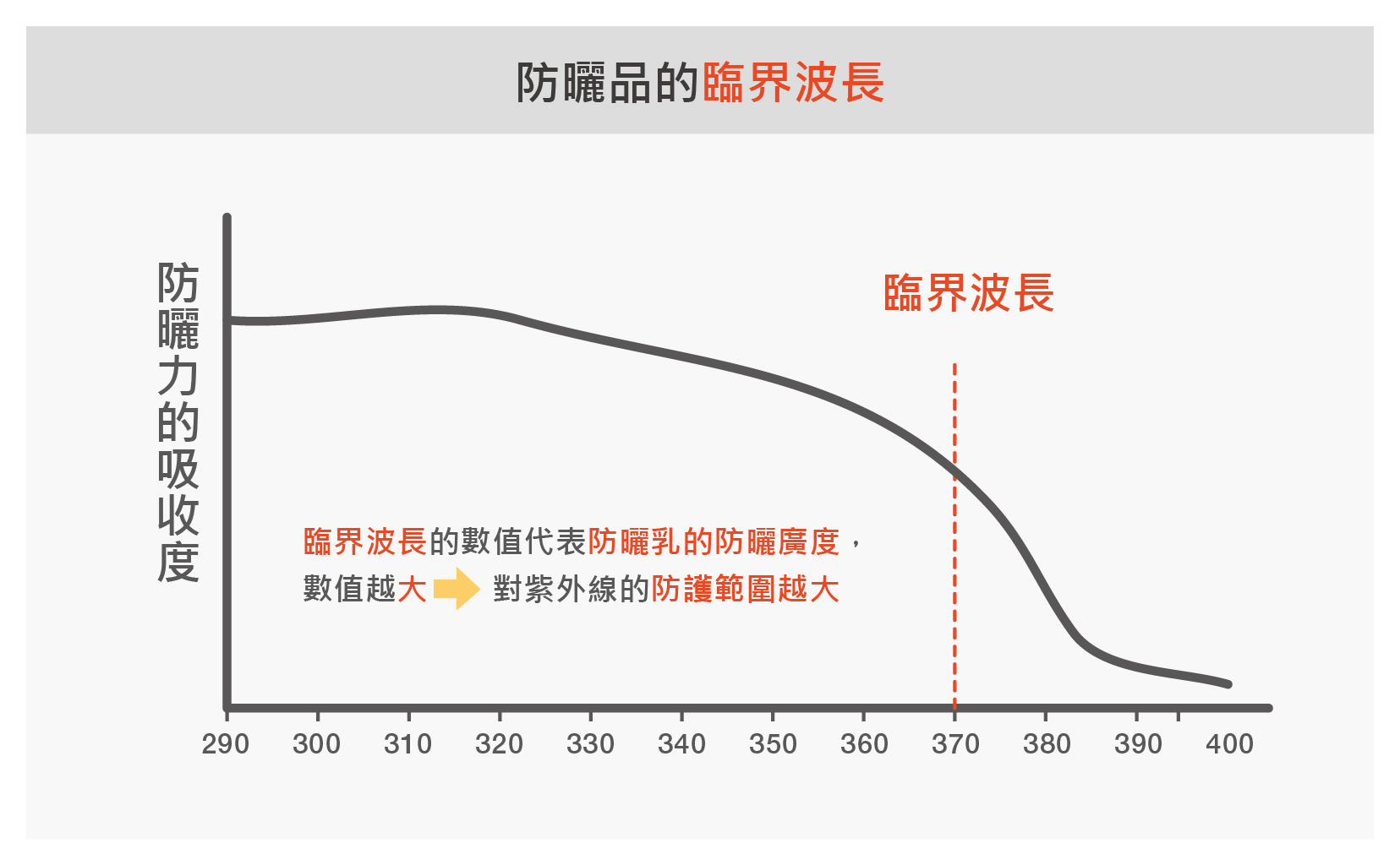紫外線可以區分成UVA、UVB與UVC,其中UVC多數為臭氧層吸收,不易到達地表,因此不必過度在意。UVA和UVB則可根據波長,區成短波的UVA2、UVB與長波的UVA1,其中波長越長的輻射,不但越難被阻擋,數值也通常是短波的10至100倍!因此多數防曬對於短波的UVB與UVA2都有不錯的阻擋能力,但隨著波長增加,防曬的防護力就會持續下降,而達特定波長時,防護力會突然陡降,這個陡降的波長,就被稱為「臨界波長」!因此它同時也代表了防曬劑的防護範圍。一般來說,建議選擇符合美國法規標準,臨界波長達370nm以上的寬頻防曬乳,才能夠完整保護肌膚免於長波與短波紫外線的傷害。