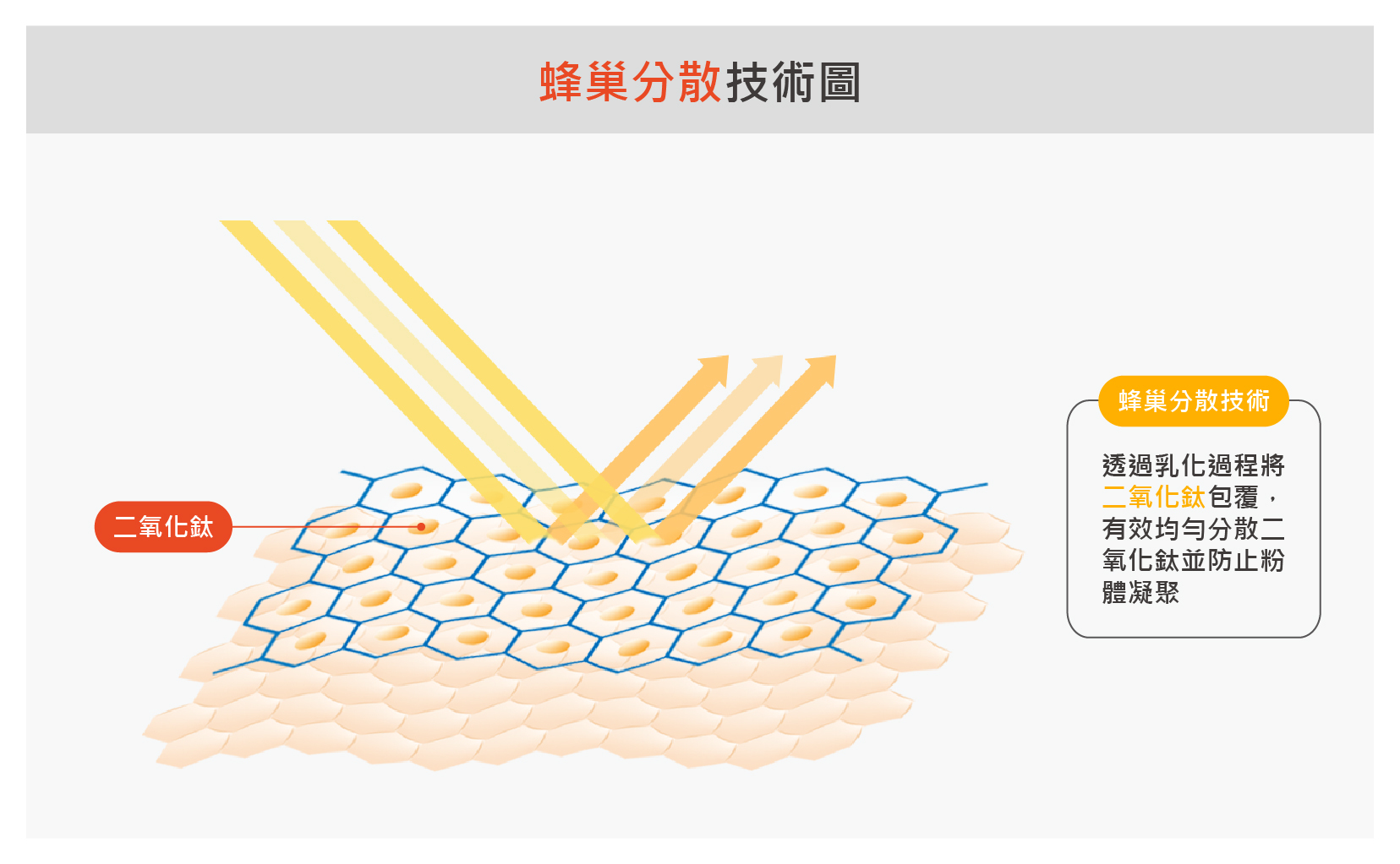 (圖1:蜂巢分散技術:透過乳化過程將二氧化鈦包覆,有效均勻分散二氧化鈦並防止粉體凝聚)