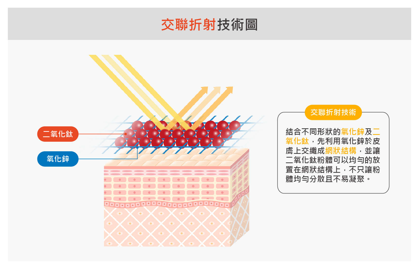 (圖2:交聯折射技術:結合不同形狀的氧化鋅及二氧化鈦,先利用氧化鋅於皮膚上交織成網狀結構,並讓二氧化鈦粉體可以均勻的放置在網狀結構上,不只讓粉體均勻分散且不易凝聚)