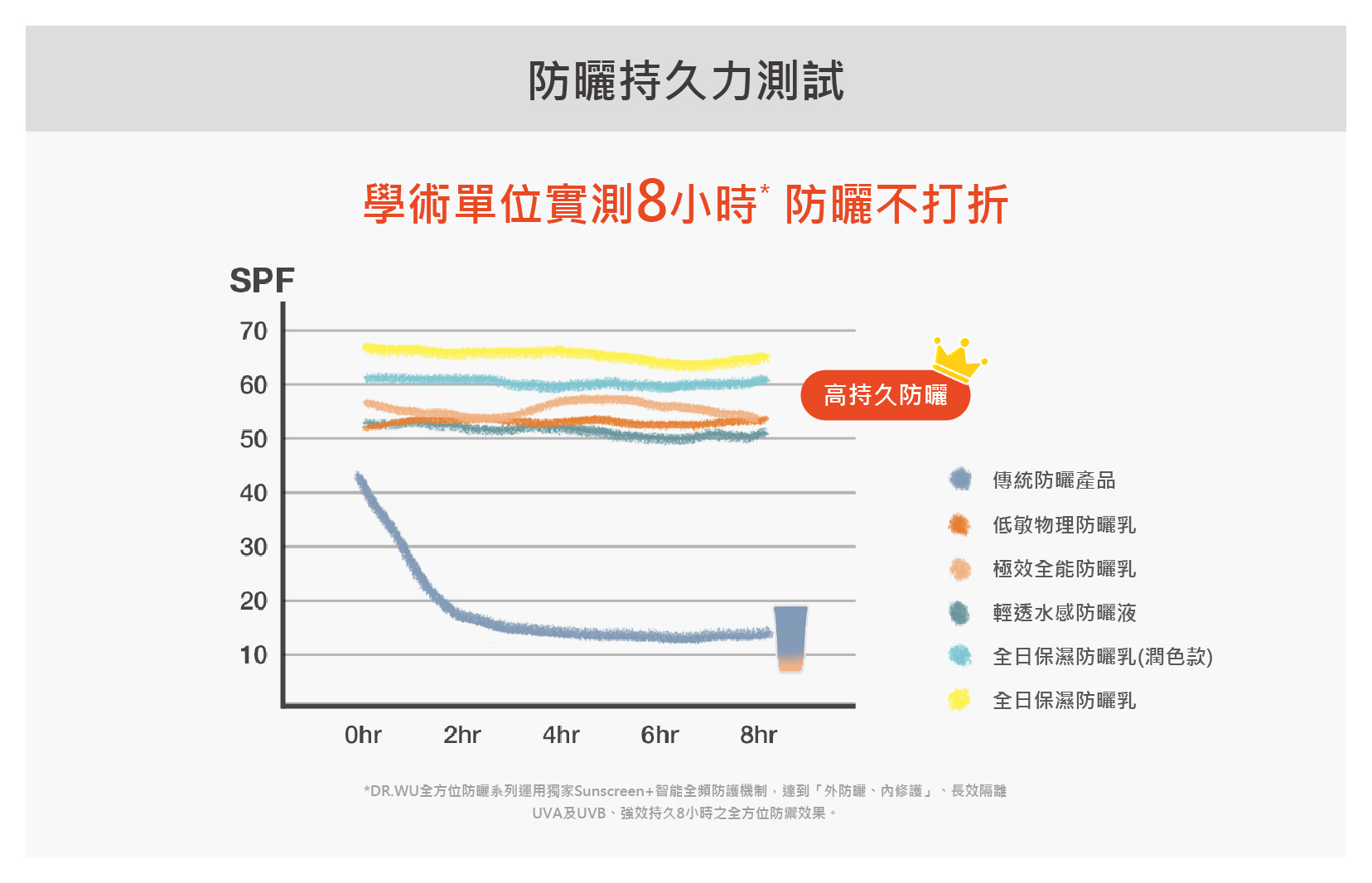 目前業界對於防曬持久力,尚無統一的數值標示,因此學界多透過實測方式進行檢驗,從下方實測可發現,多數防曬的防護力,確實在2小時候,開始急速衰減。然而,仍有不少高效防曬,能夠長時間維持防護力,近期甚至有防曬可以維持達8小時之久!