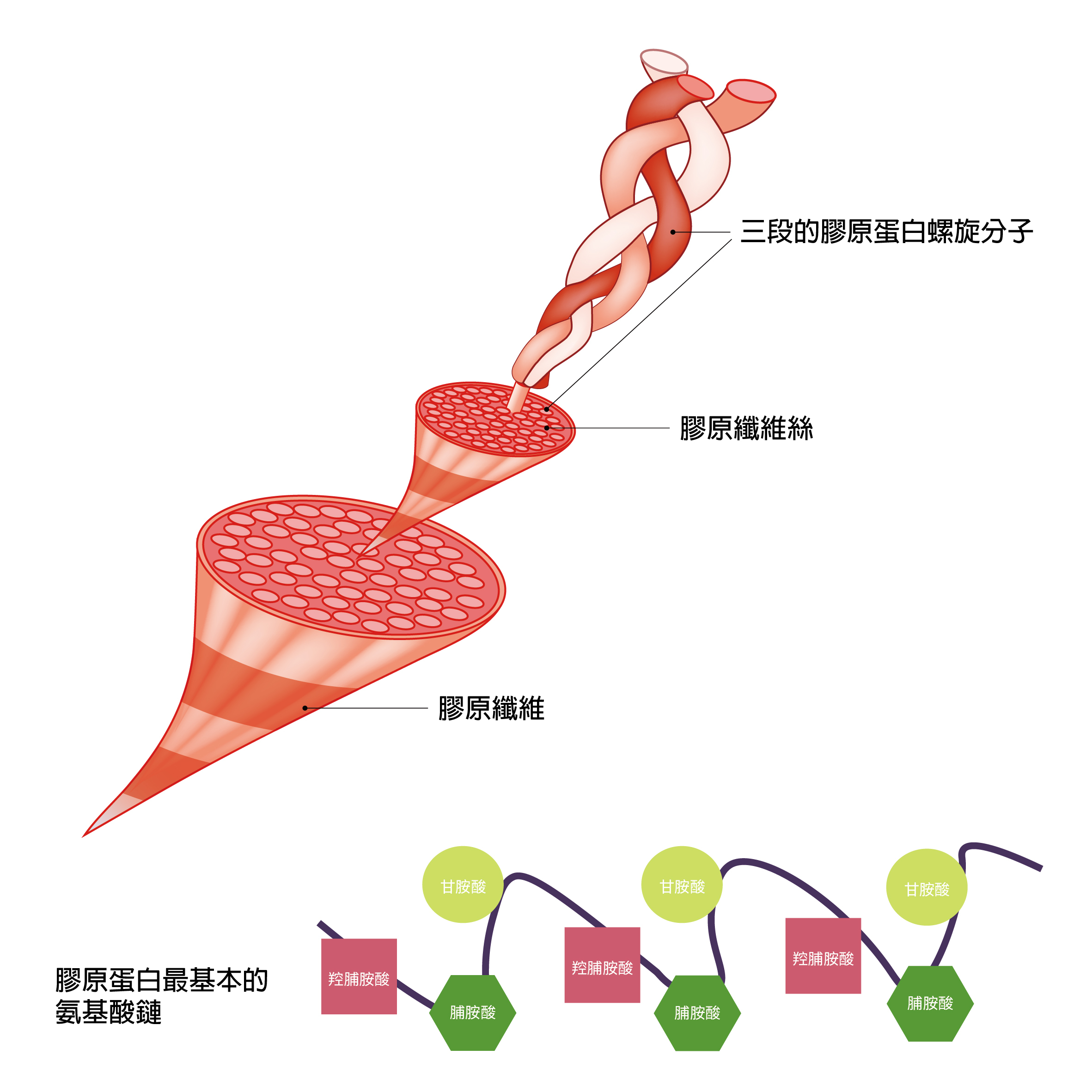 簡單來說,膠原蛋白其實就是我們人體中的一種蛋白質,屬於纖維性蛋白,主要由脯胺酸、甘胺酸、羫脯胺酸三種氨基酸聚合而成,分子量高達數十萬,甚至數百萬的巨大螺旋結構。大約佔蛋白質總量的25%-35%,廣泛分佈在皮膚、牙齦、關節、血管等。<附圖一>