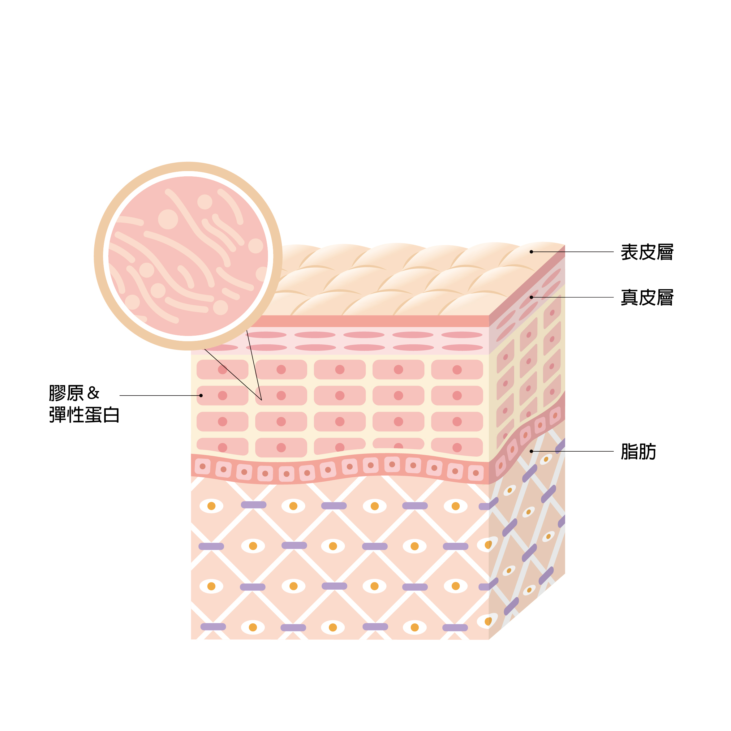 尤其皮膚中膠原蛋白含量非常豐富,扮演著「支撐」的角色,它就像是肌膚底層的鋼筋,賦予肌膚韌性及彈性,且具有良好的保水能力,能讓人看起來青春緊緻。<附圖二>