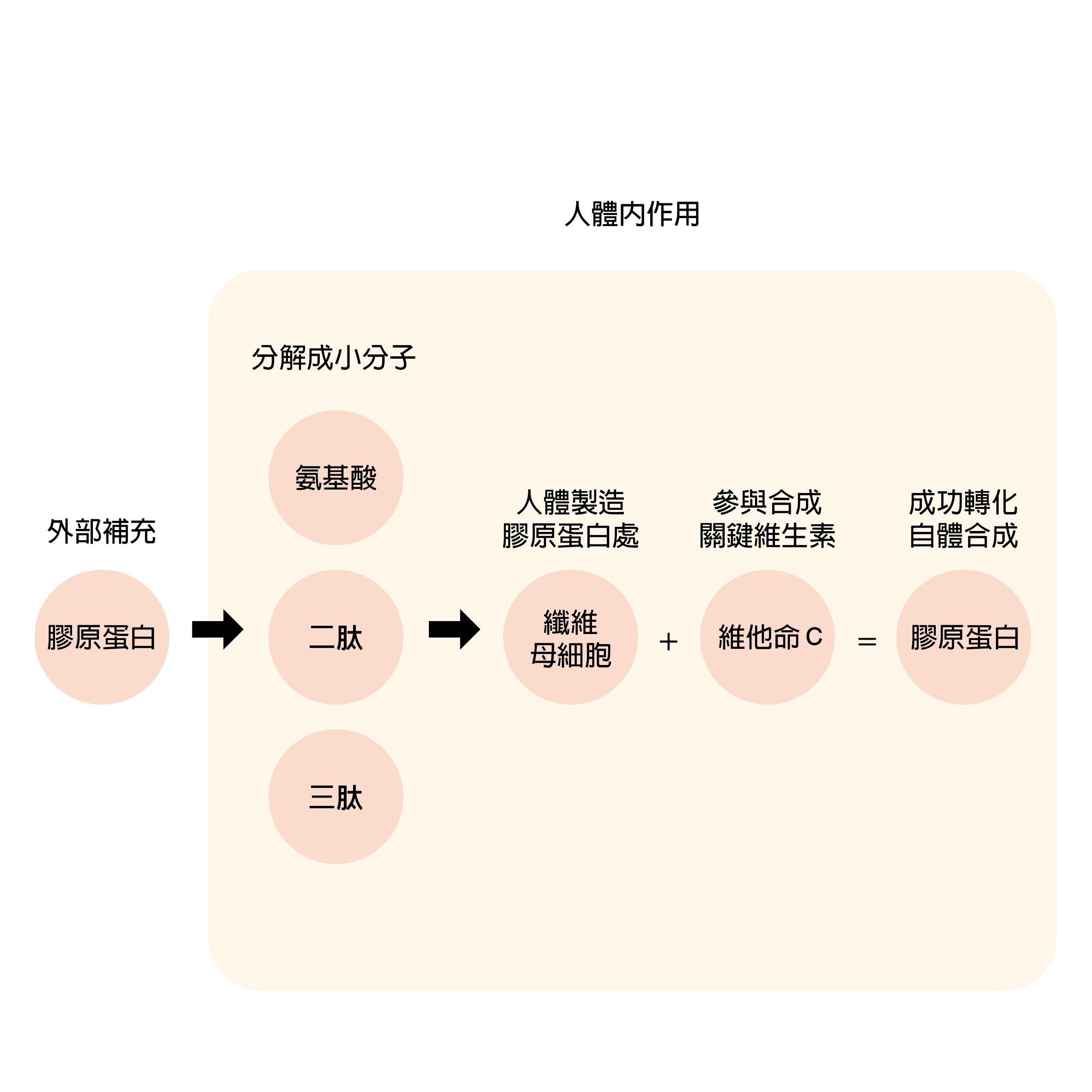 當蛋白質食物或膠原蛋白補充品吃進肚子後,會首先在消化道被分解成二肽、三肽、氨基酸, 分解至平均3000道爾頓的小分子胜肽,被腸道吸收利用,而這些原料再透過纖維母細胞及維生素C的幫助下能合成膠原蛋白。<附圖三>