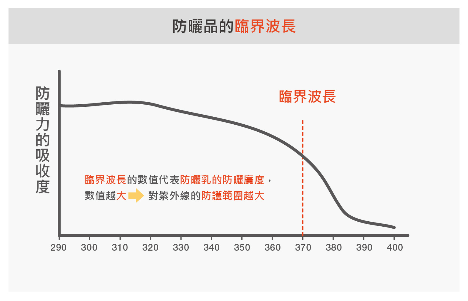 紫外線波長越長,越難被阻擋,大部分防曬產品都可做到對抗UVB,但隨著防護波長越長,當到達一定的數值會突然急遽下降,而這個陡降的點被稱為臨界波長,臨界波長的數值代表防曬乳的防曬廣度,數值越大代表它對紫外線的防護範圍越大。而所謂的寬頻防曬,根據美國法規規定臨界波長需到達370nm才可標示寬頻防護(Broad Spectrum),所以要注意防曬能涵蓋紫外線的波長夠寬廣,這樣才能有效對抗UVB與UVA,防曬效果更佳,徹底預防曬黑、曬老。