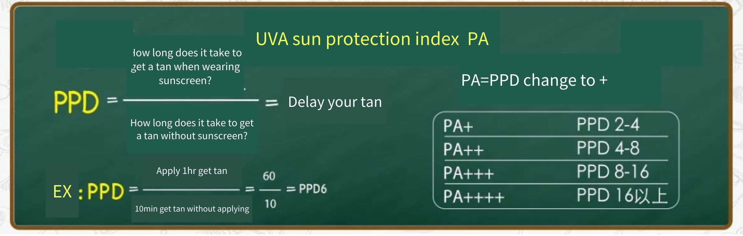 1. Protection strength: SPF measures protection from UVB rays. Read PA or PPD for UVA protection. The latter two measurements indicate the product's ability to delay tans, and a higher value suggests better UVA protection and therefore takes longer time to develop tans. The plus (+) sign after PA is converted from PPD value. Do take note that people generally put on less sunscreen than is ideal, so we recommend SPF rating of 50 or above against UVB and PA+++ or above (Dr. Li recommends 4 +'s while some of DR.WU's products recommend 3 +'s) against UVA to effectively delay development of tans.