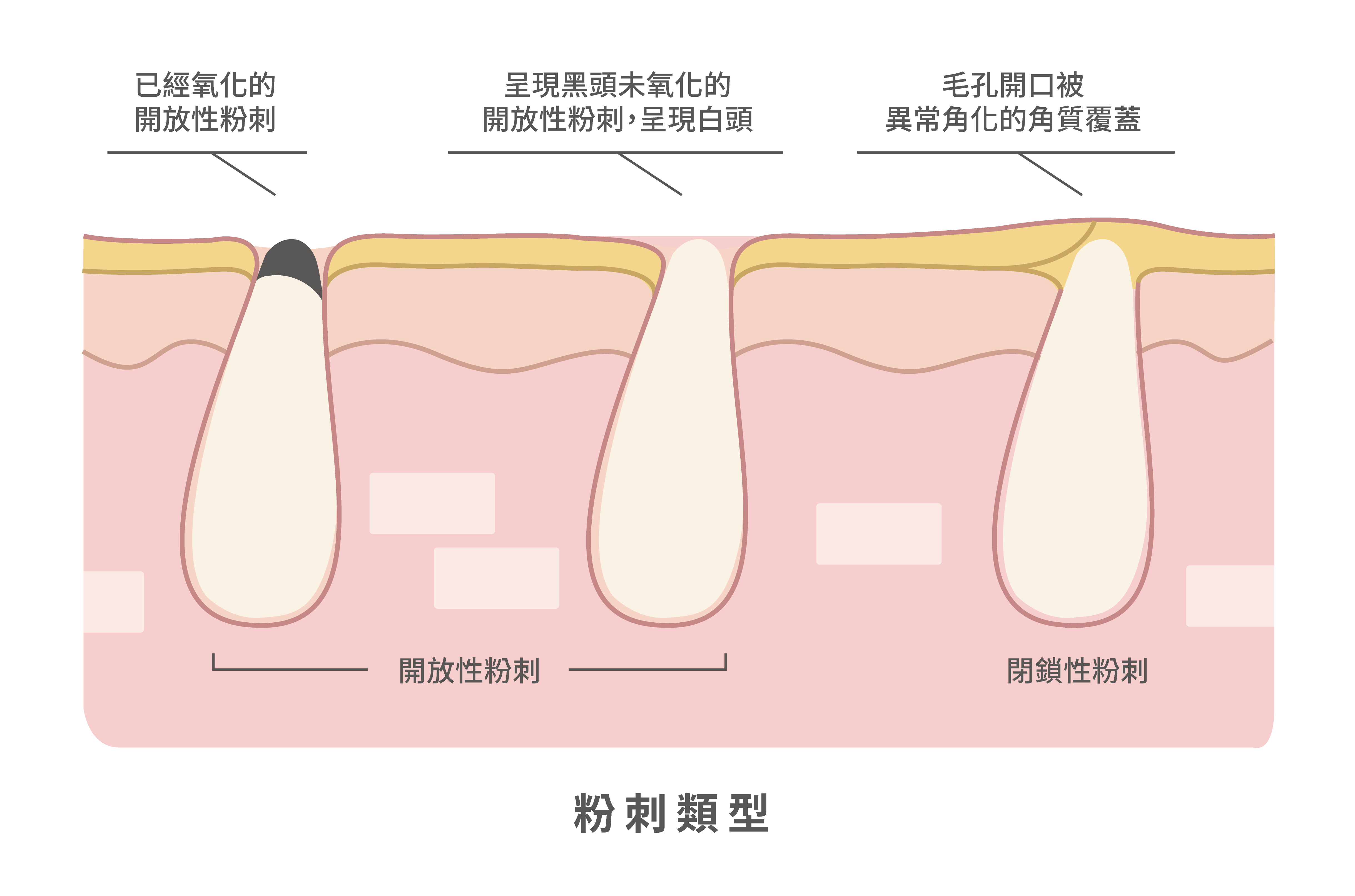 前面提到正常的毛孔是有開口的,但因為角質代謝不正常,原本該自然脫落的老廢角質還是牢牢固定在角質層,舊的角質不離開,新的角質又一直被推上來,最後毛孔開口處被異常過度角化的角質堆滿,使得原本暢通的開口被封住。此時,皮脂腺分泌的油脂因開口被堵排不出去而全堆在毛孔裡,漸漸地越堆越多,就是所謂的閉鎖性粉刺,肉眼看或用手觸摸可能只有些微不平或凸起。