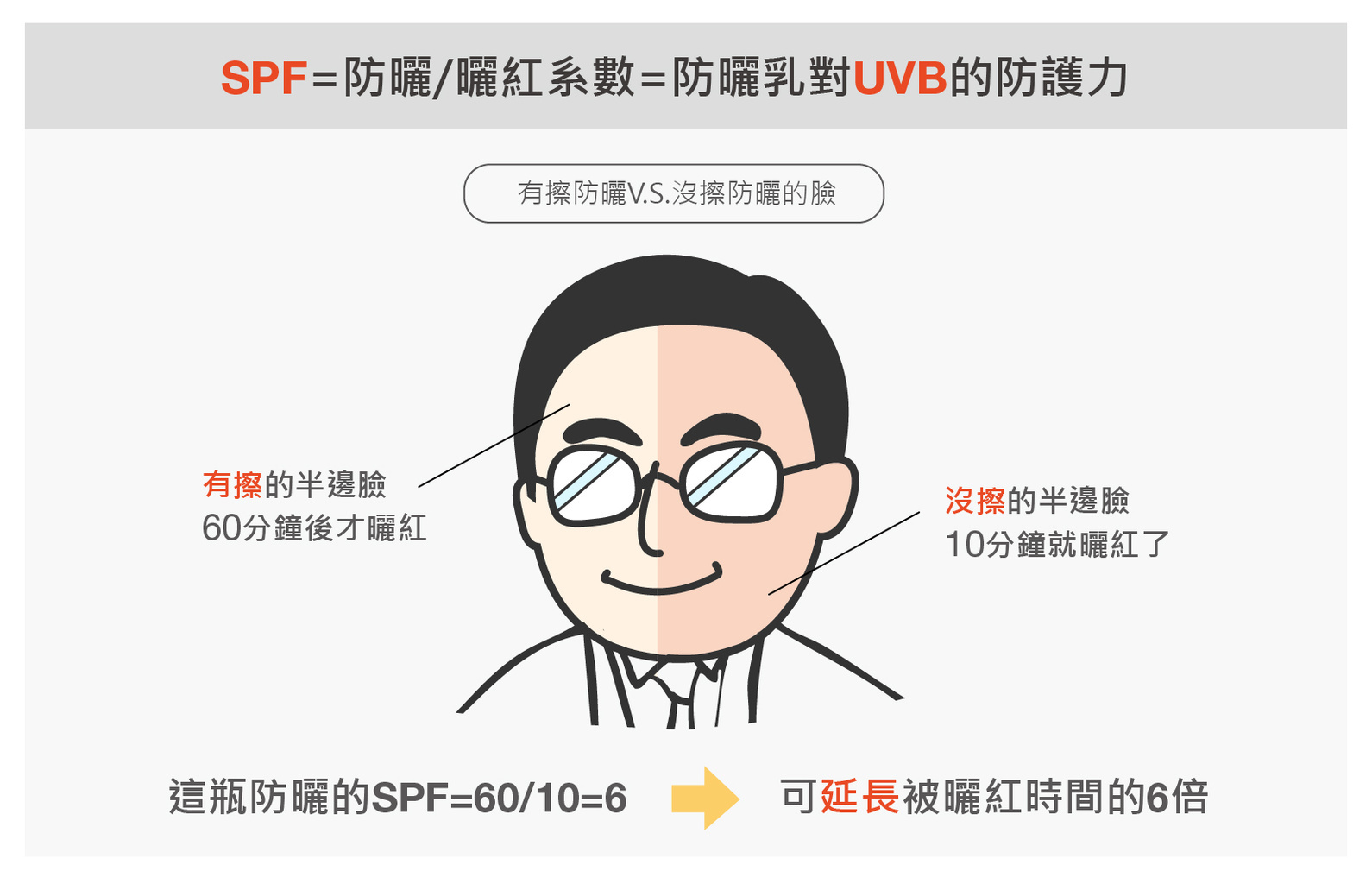 SPF是看防曬乳對UVB的防護力。它的測試方法是在皮膚上一邊擦防曬產品、一邊沒擦,看曬多久後皮膚會變紅,假設有擦的那邊1個小時後才變紅、沒擦的那邊10分鐘就曬紅,表示這瓶防曬乳的係數是SPF6(60/10=6),也就是可延長被曬紅時間6倍。以此類推,SPF50就表示可延長被曬紅的時間50倍。當然實際被曬紅的時間還是要看每個人的膚質和當下紫外線指數的強度。一般建議基本要SPF20以上,進階則選SPF50以上。
