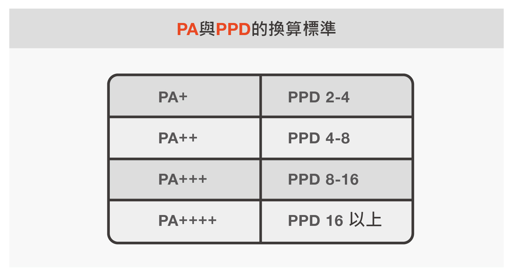 這個大家最熟悉的標示是日本化妝品工業聯合會定的。PA是把歐規的PPD係數簡化,用+號來代替,越多個+代表防止曬黑曬老的能力越強,最多4個+。一般建議基本要PA+++(PPD8~16),進階PA++++(PPD16~)。