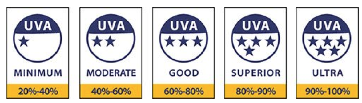 這是英國的標準,概念跟歐盟的UVA一樣,只是分得更仔細。只要UVA的防曬力是UVB的20%~40%就能獲得一顆星,以此類推UVA的防護力有達UVB的40~60%兩顆星、60%~80%三顆星、80%~90%四顆星、90%~100%五顆星。一般平日上班或短時間外出逛街,選擇三顆星標示的就很足夠了,若要長時間戶外運動,可選擇4顆星以上的防曬產品。