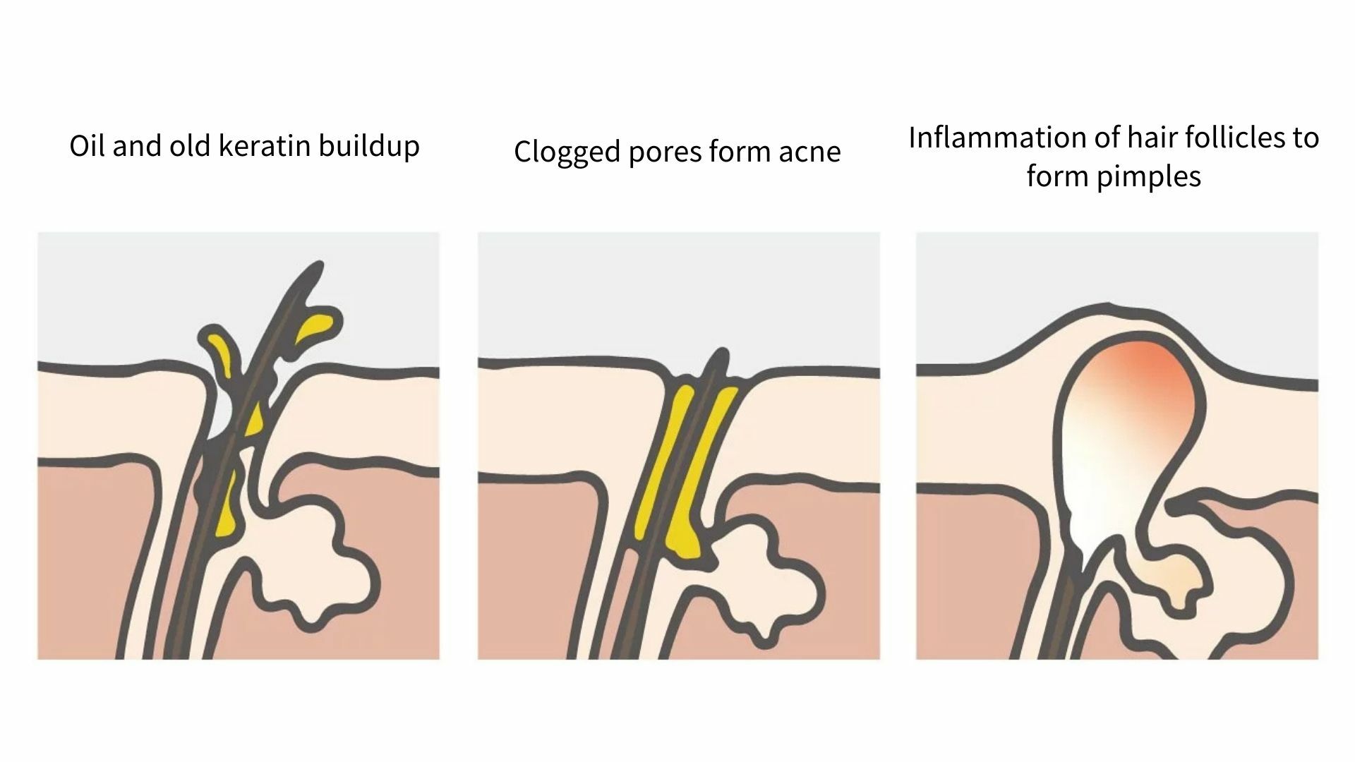 The reason why acid can improve acne, pore and pimple is because its mechanism of action to reboot the metabolism of stratum corneum, so that the pores wouldn’t be clogged. When there is acne, it means that the metabolism of stratum corneum is abnormal. Normal stratum corneum sheds off every once in a while, but some people’s stratum corneum can’t function normally and leads to clogged pores, and what’s inside will accumulate and become acne; it is what leads to pimple, and usually comes with the problem of large pores.