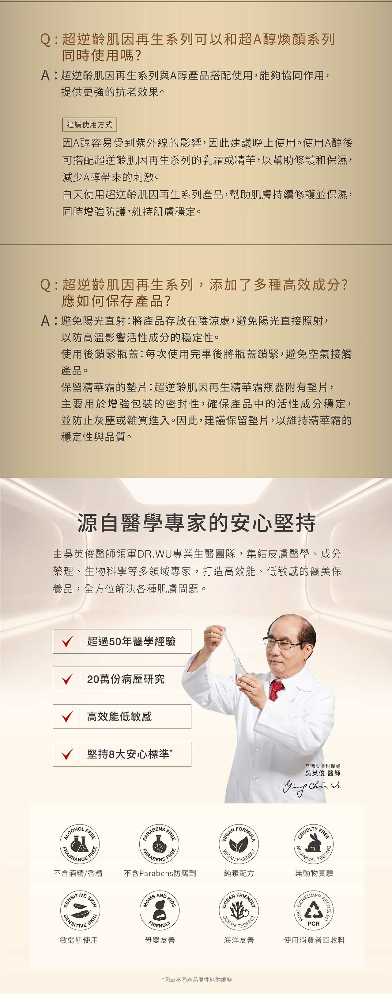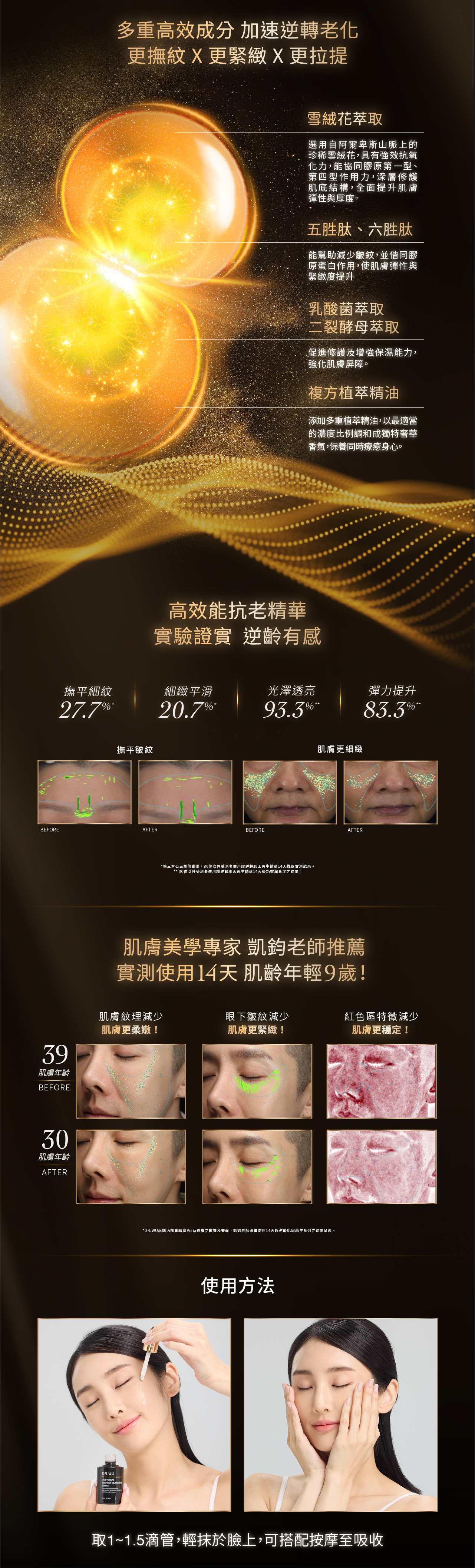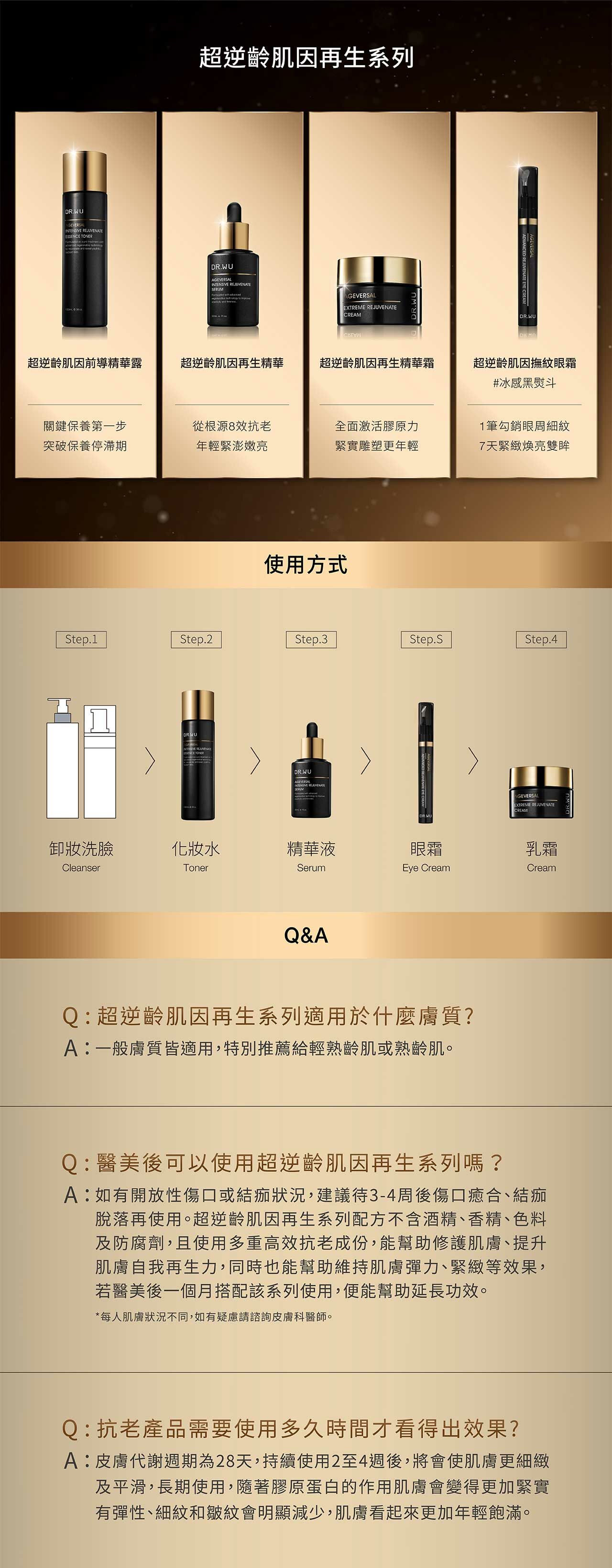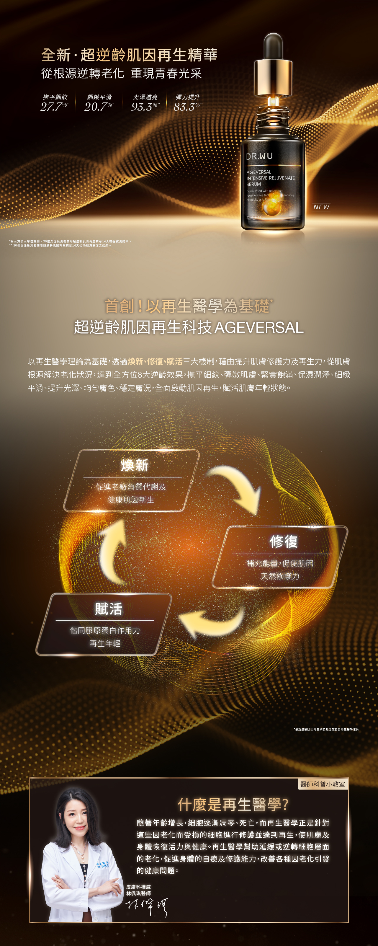 導入「煥新、修復、賦活」機制,從根源解決老化狀況,代謝老廢肌因,並提升肌因自我再生力及修護力,全面啟動肌因再生,賦活肌膚年輕狀態。