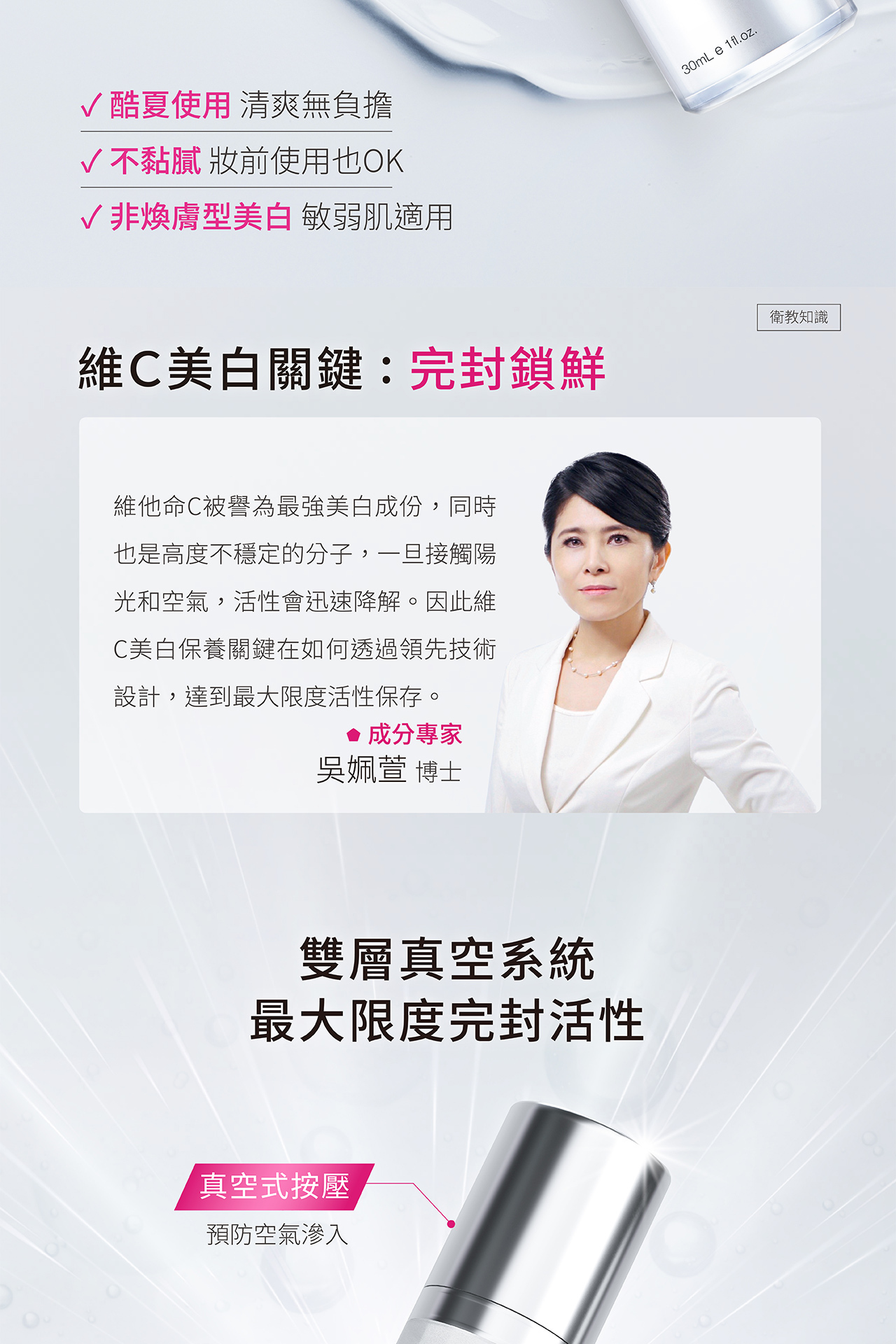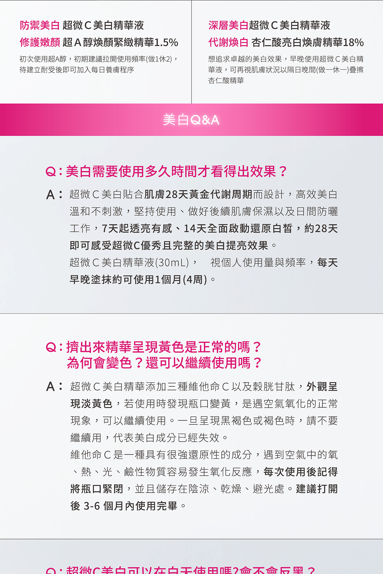 完美複合三種維他命C(乙基C、長效C、微脂C)並結合多種高濃度美白植物精萃所打造的美白革命科技超微C,全面啟動斷黑機制、勻亮膚色,再搭配菸鹼醯胺(B3)舒緩、以及角質分解因子Melaclear 2加速肌膚更新,輕盈水感質地易吸收,不留黏膩感,幫助改善暗沉、膚色不均等膚色困擾,為肌膚帶來細膩光澤,打造淨、透、勻、亮、白的鑽石般肌膚。溫和不刺激配方,敏弱肌也能安心美白,且無光敏問題,早晚皆可塗抹、全天候美白不打烊。