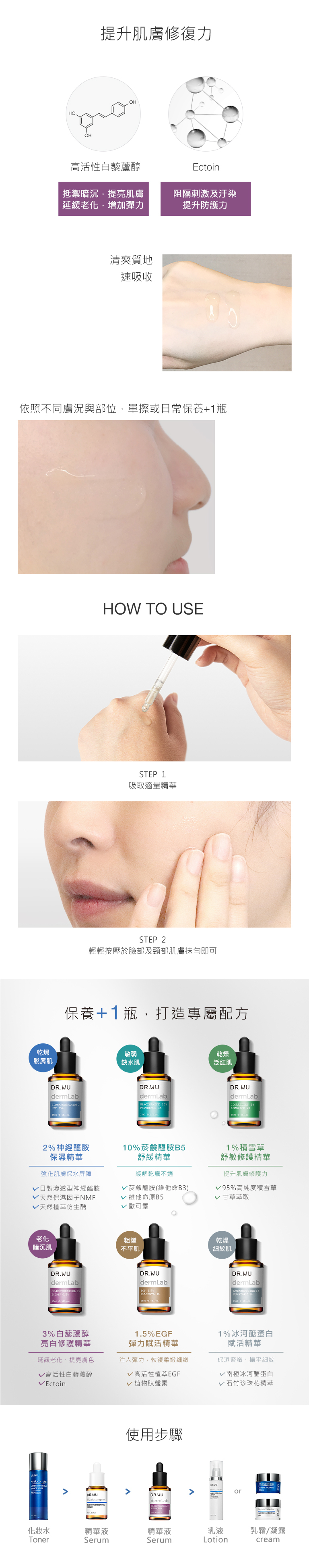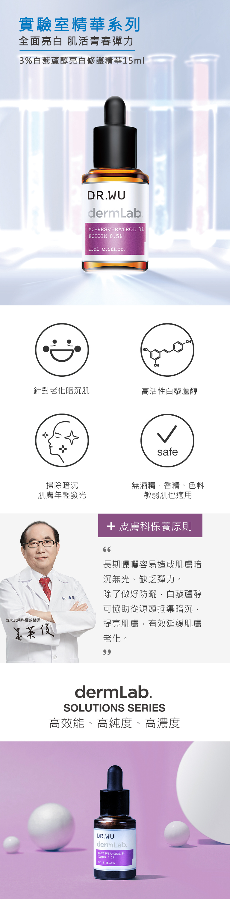 「實驗室精華系列」模擬醫師配方概念,嚴選各種高效能、高純度、高濃度成分,調製完美比例、滴滴極效的成分精華。「3%白藜蘆醇亮白修護精華」採用微囊型的高活性白藜蘆醇,幫助肌膚從源頭對抗UV刺激,有效延緩肌膚老化、提亮膚色;搭配Ectoin強化肌膚修復與防禦力,保護肌膚不被外在刺激侵擾,肌膚細緻有光澤。質地清爽好吸收、不悶、不黏、不致痘,不添加酒精、人工香精、人工色料、PARABEN類防腐劑,敏弱肌也適用,日常保養+1瓶,改善暗沉、缺乏彈力的肌膚。