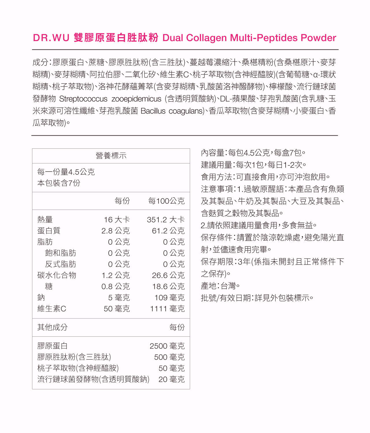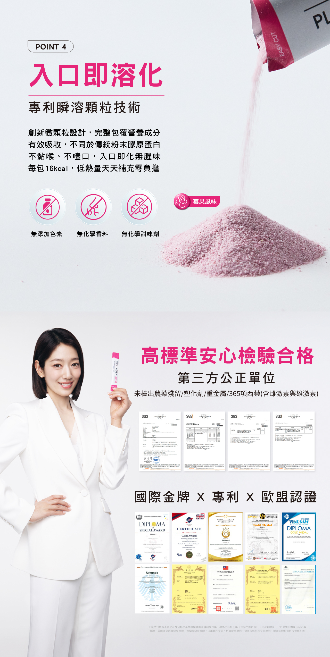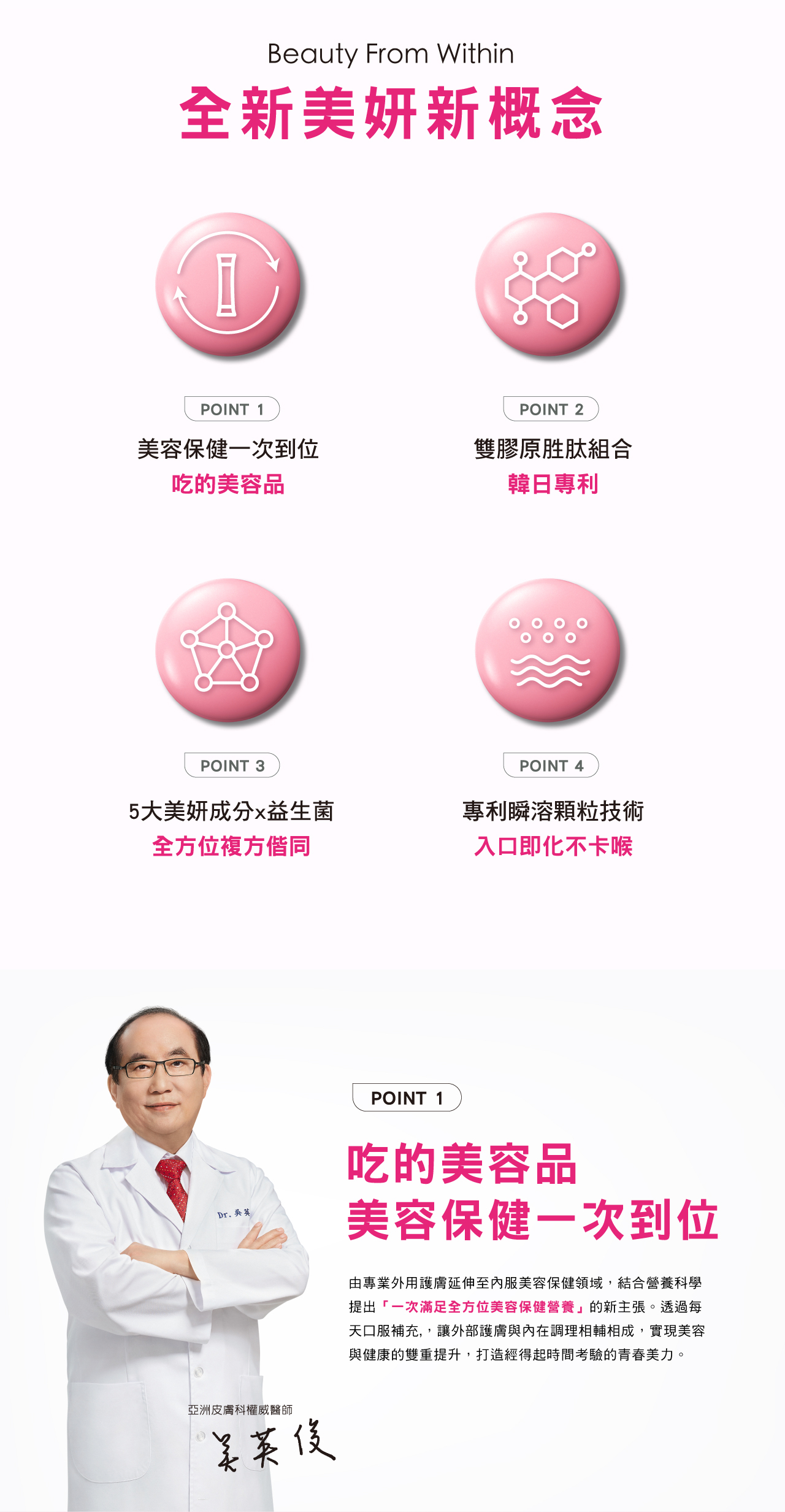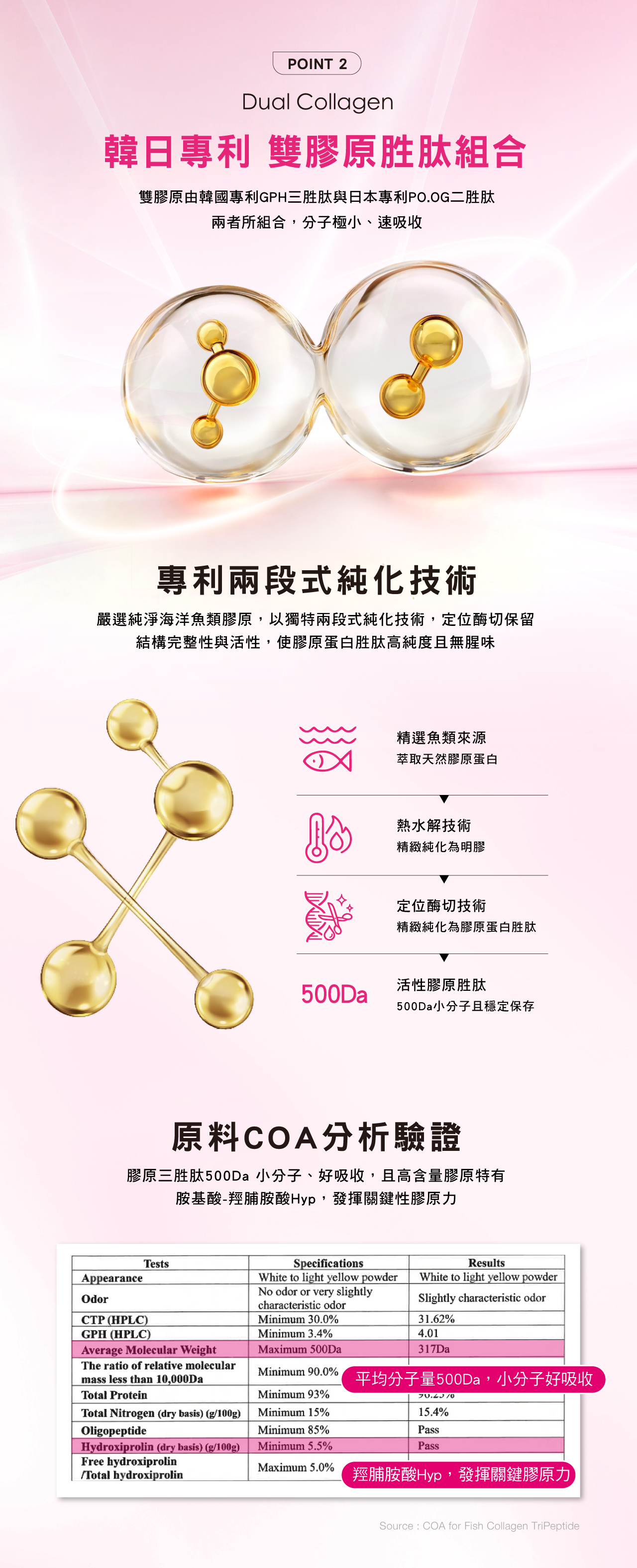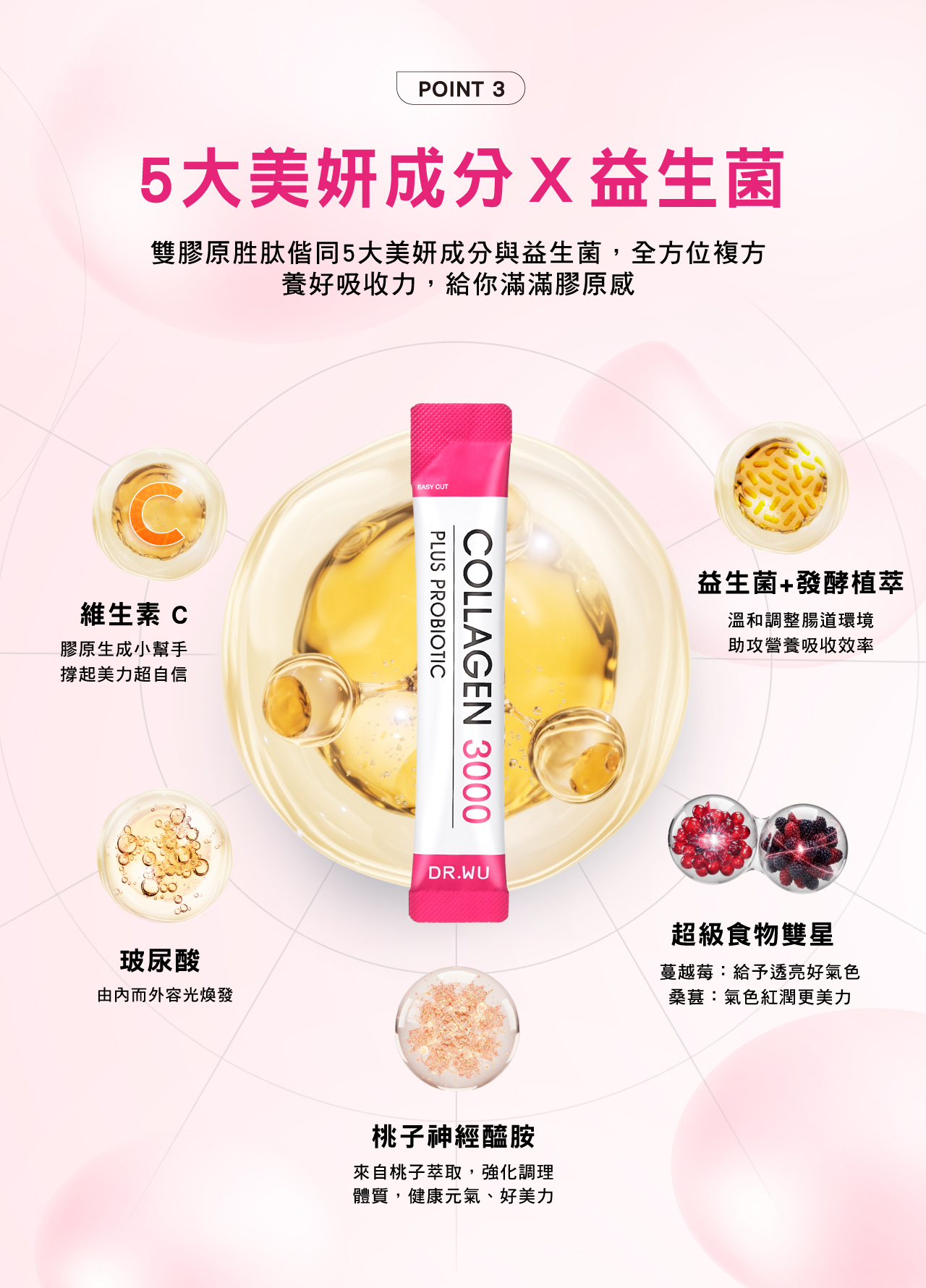 嚴選韓日專利雙膠原胜肽,500Da小分子好吸收,搭配桃子神經醯胺、玻尿酸、維生素C等五大美妍成分,全面調理機能。