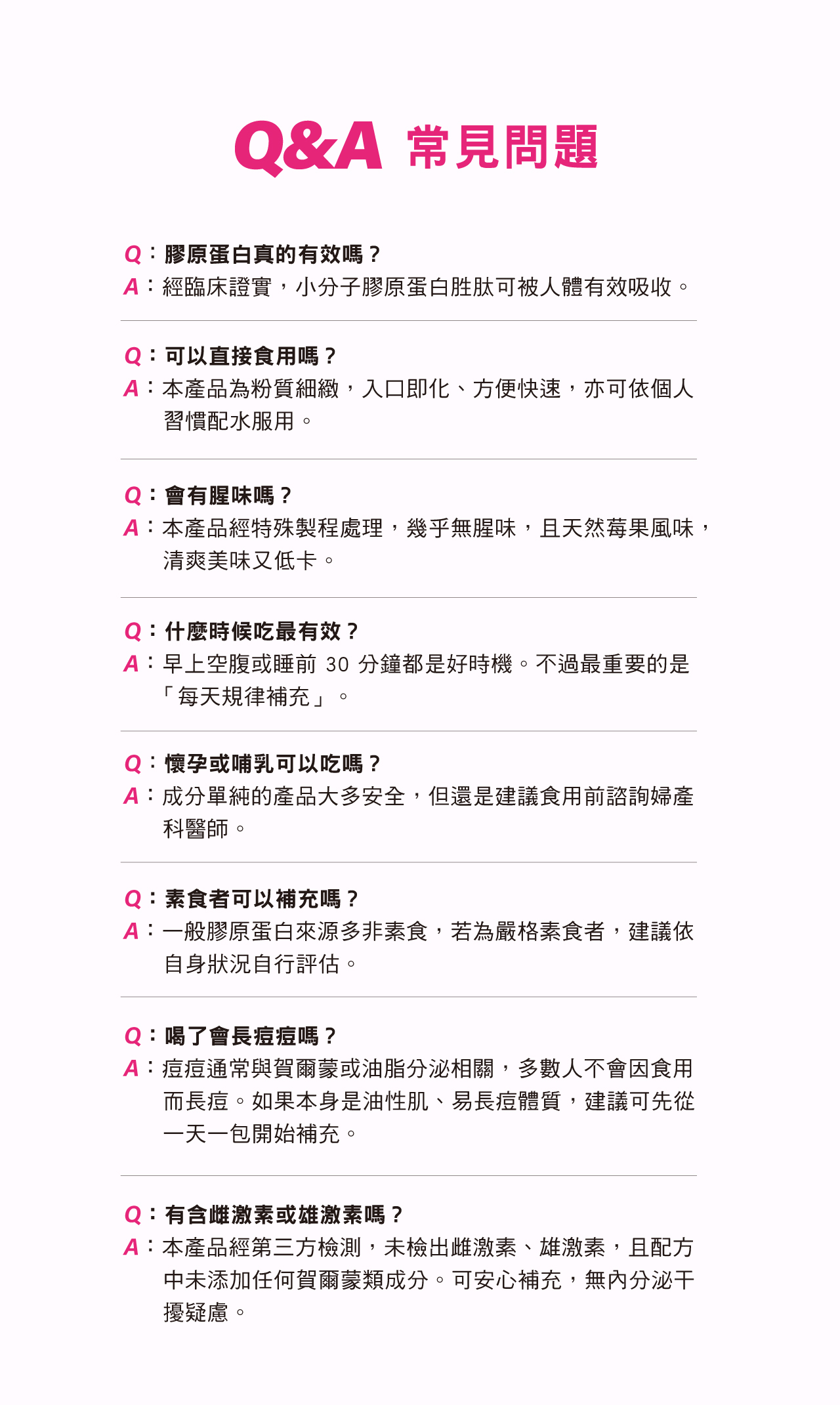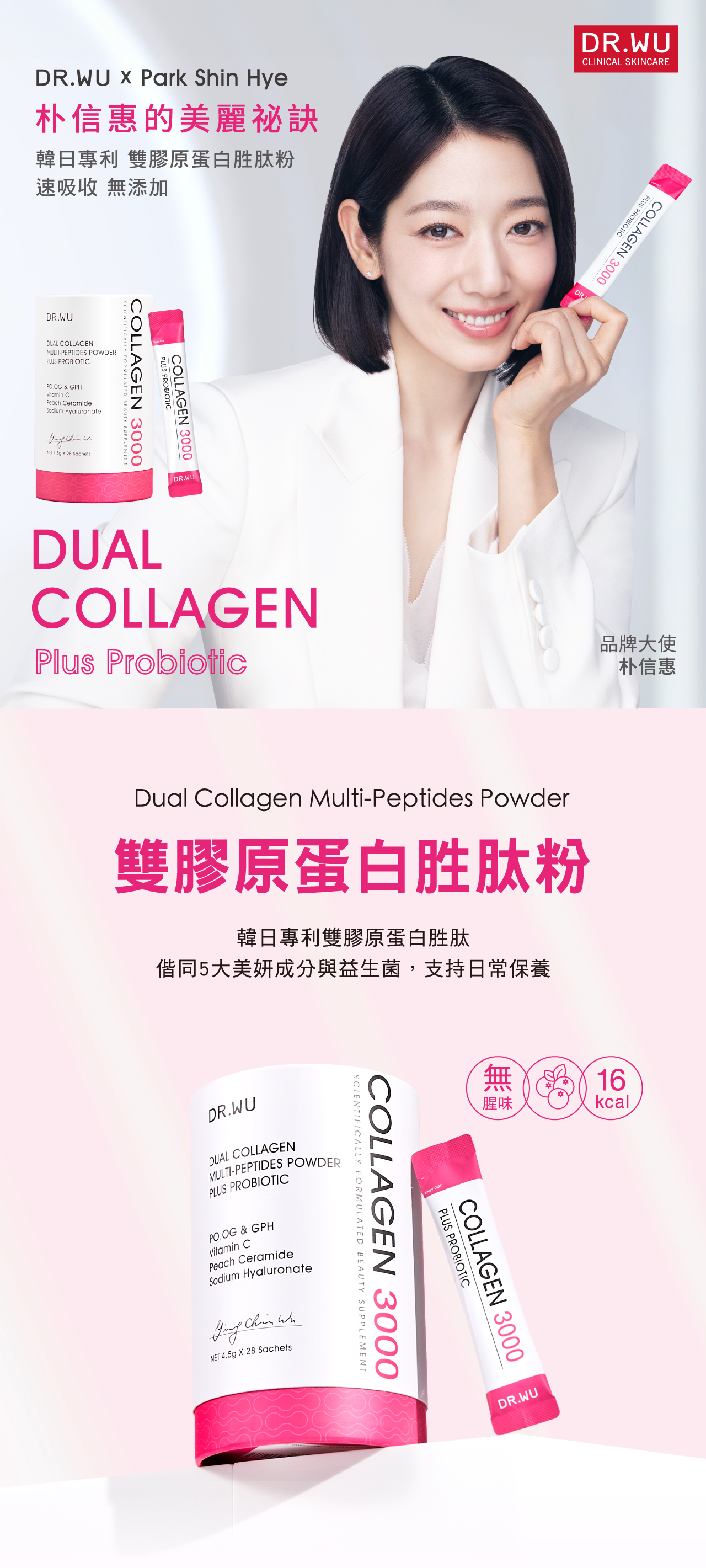 嚴選韓日專利雙膠原胜肽,500Da小分子好吸收,搭配桃子神經醯胺、玻尿酸、維生素C等五大美妍成分,全面調理機能。