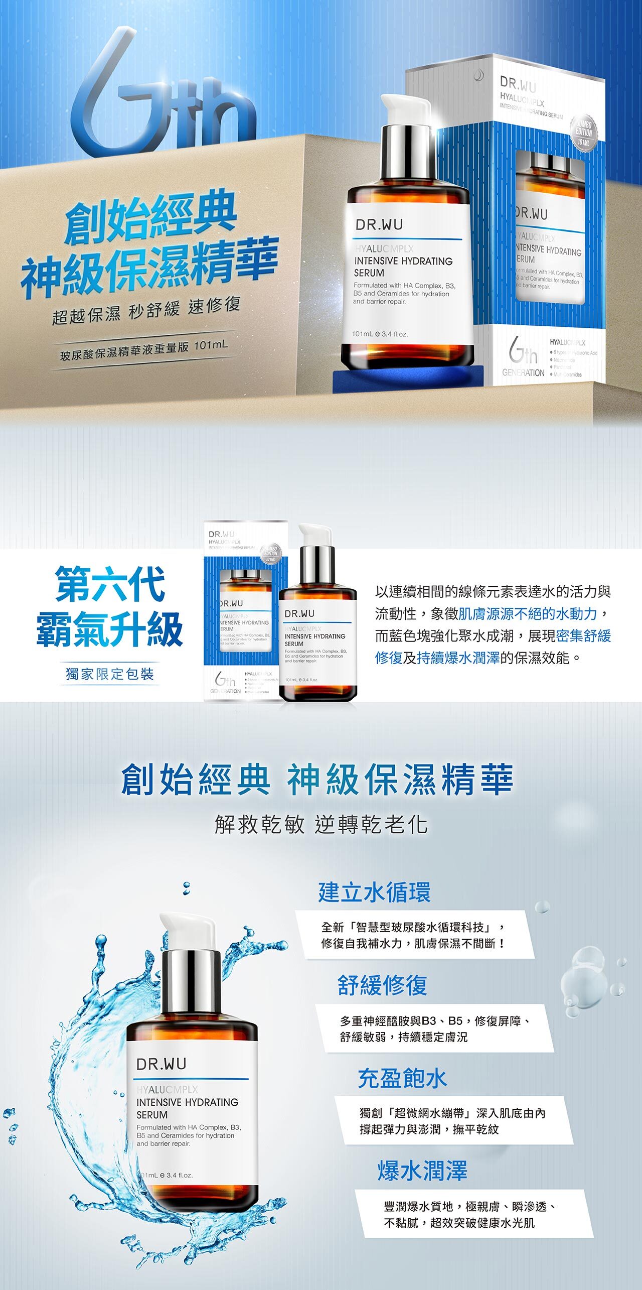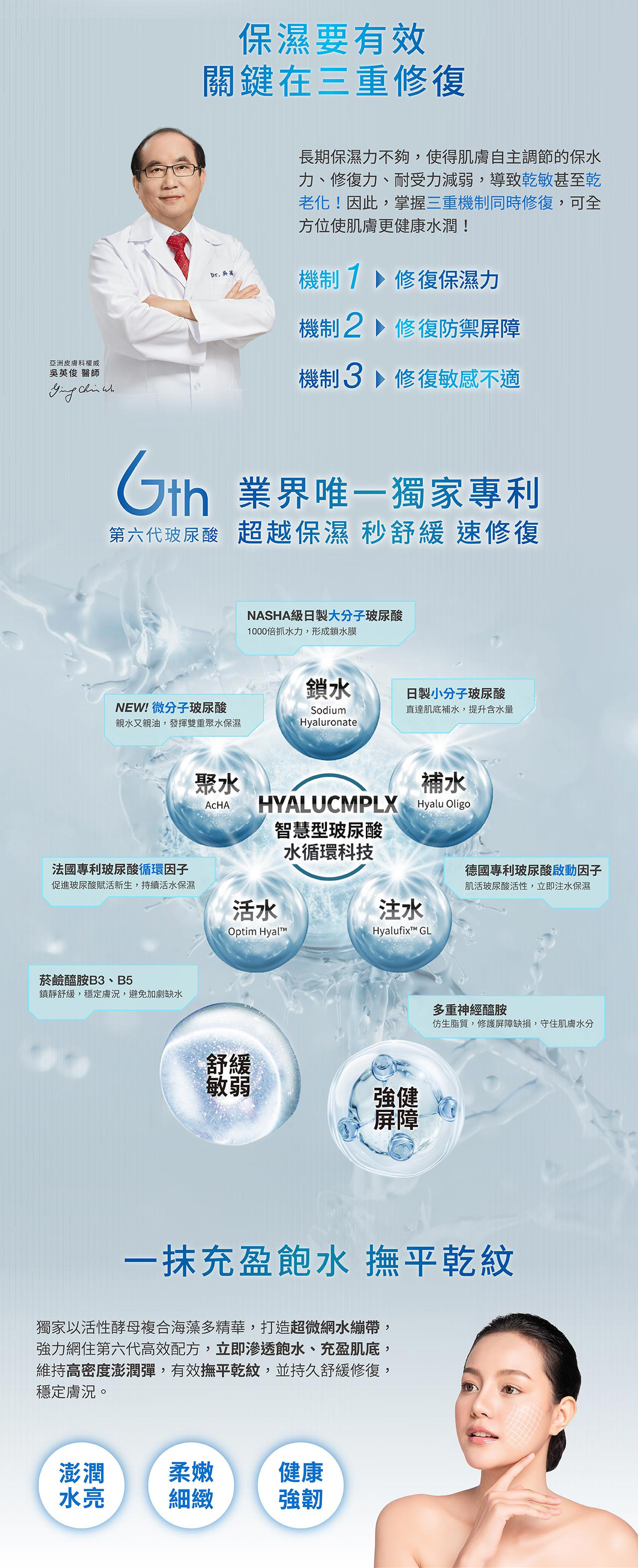 獨家第六代「智慧型玻尿酸水循環科技」完美結合5重玻尿酸,達到鎖水、補水、注水、活水、聚水,修復自我補水力,搭配多重神經醯胺與B3、B5,達到超越保濕、速修復、秒舒緩。並以活性酵母複合海藻多醣精華,獨創「超微網水繃帶」,不僅層層深入肌底修復,更強力網住全新第六代玻尿酸,啟動無限水循環,倍速充盈飽水、撫平乾紋、撐起澎潤度,同時如繃帶般呵護肌膚,持久舒緩修復,穩定膚況,預防玻尿酸流失,有效解救乾敏、抗乾老,打造神級水繃帶。