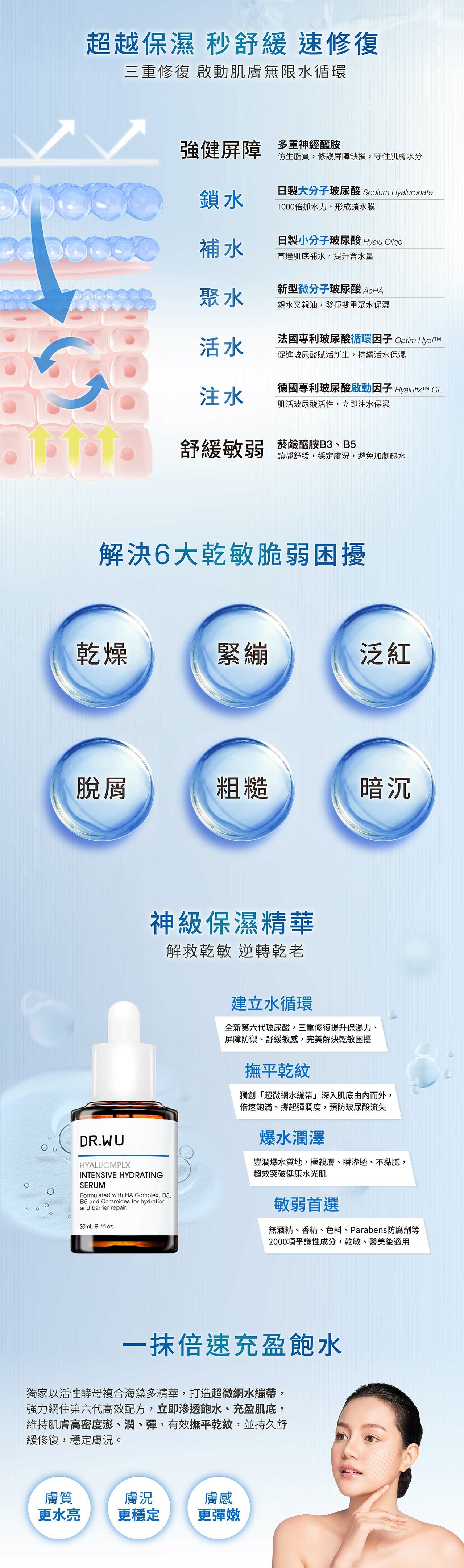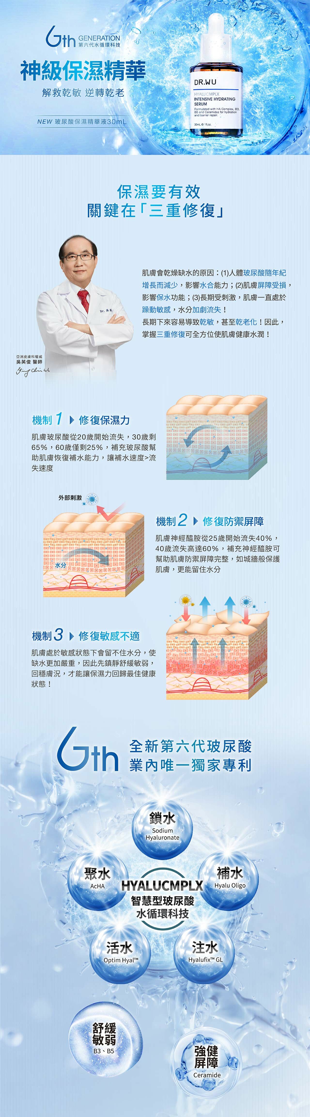 2. 全新第六代玻尿酸,提升保濕力、修復屏障,舒緩敏感不適,完美解決乾敏困擾。