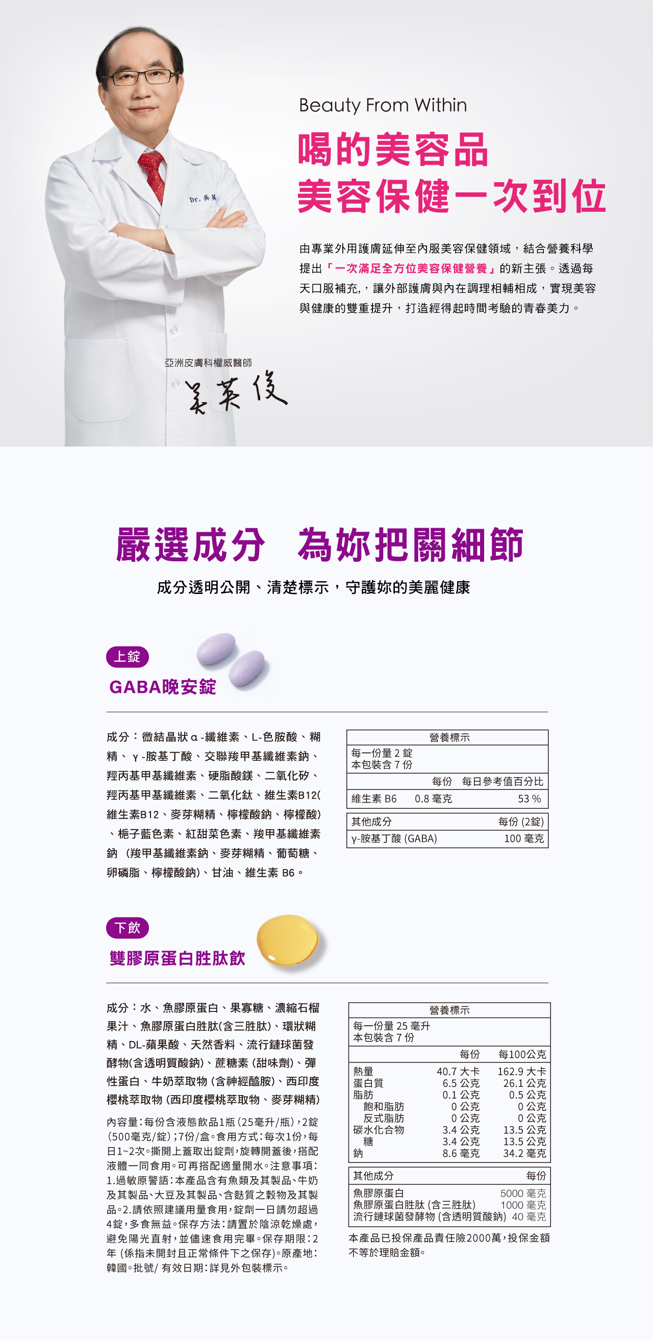 超濃縮小分子雙膠原胜肽,結合二胜肽與三胜肽,分子量低於500Da,美力更有感。GABA晚安錠含GABA、色胺酸與B6、B12,補充夜間營養,幫助入睡、容光煥發。全配方不含化學色素與香料,莓果無腥味,隨開即飲。適合生活忙碌、壓力大之族群提升睡眠品質
