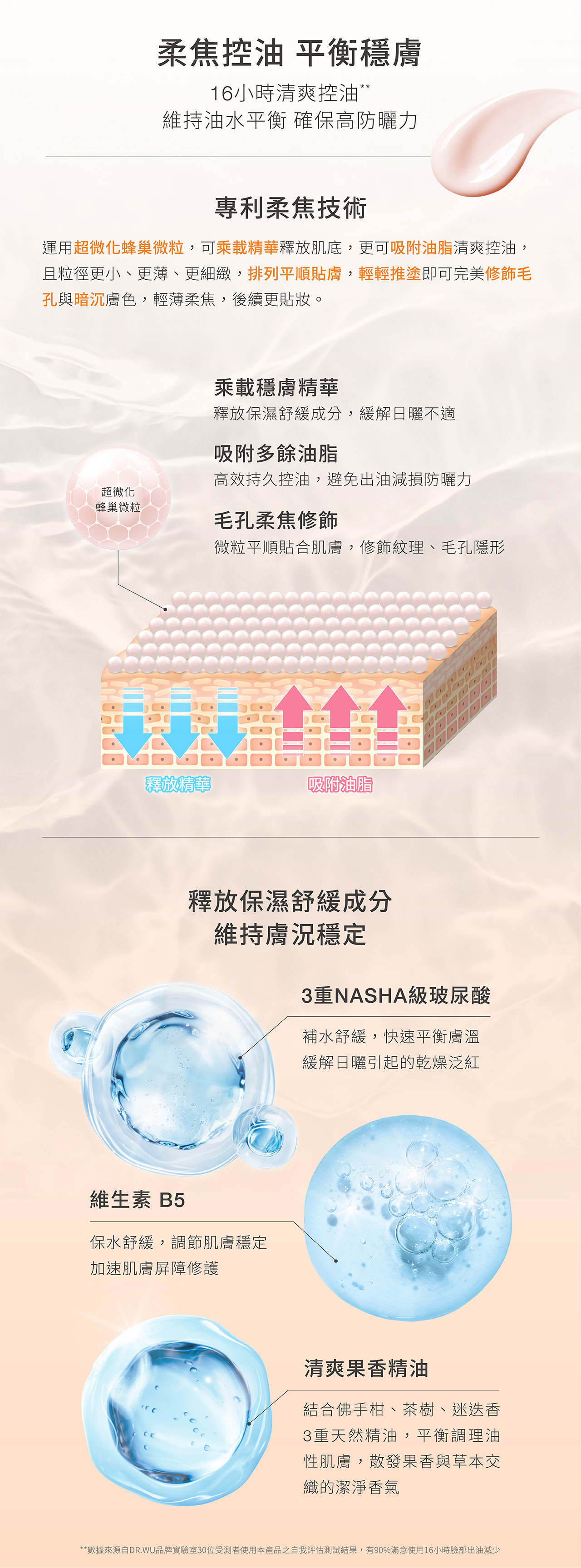 高效控油配方,能有效吸附多餘油脂,平衡皮脂分泌,並舒緩曬後不適,持久抗油光。專利柔焦技術,同時修飾毛孔瑕疵,呈現粉嫩柔霧效果,使肌膚更加細緻。運用光穩定廣譜防禦機制,長效抵禦紫外線UVA及UVB,預防曬黑及曬老,實現外防禦、內修護的全方位防曬效果。全配方不含海洋與珊瑚有害成分。